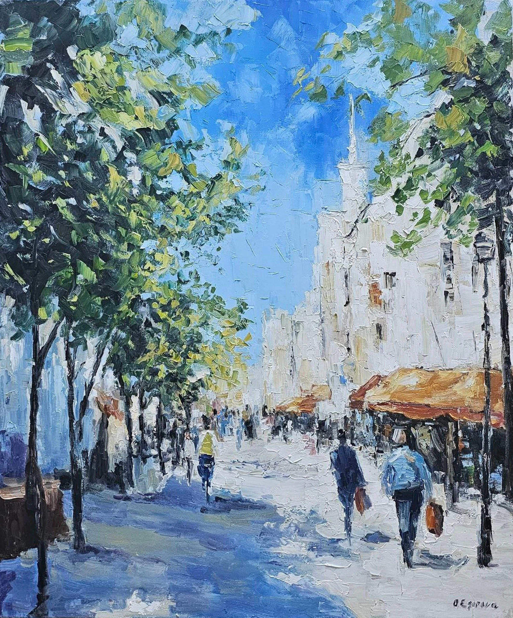 “Cityscape” by Olga Egorov captures a lively sunlit street with impressionistic flair. With bold, textured brushstrokes and a vibrant palette, the painting breathes life into an everyday urban moment. Figures walk under leafy trees while light dances on the pavement, creating a dynamic interplay of cool tones and warm highlights. The cyclist, strolling shoppers, and open-air cafes convey calm vitality. Painted in oil on canvas, this 50x60 cm artwork reflects Egorov's mastery in transforming fleeting moments into poetic stillness. Her signature impressionistic approach and sensitivity to light make this piece perfect for those seeking cheerful serenity with a touch of urban charm.