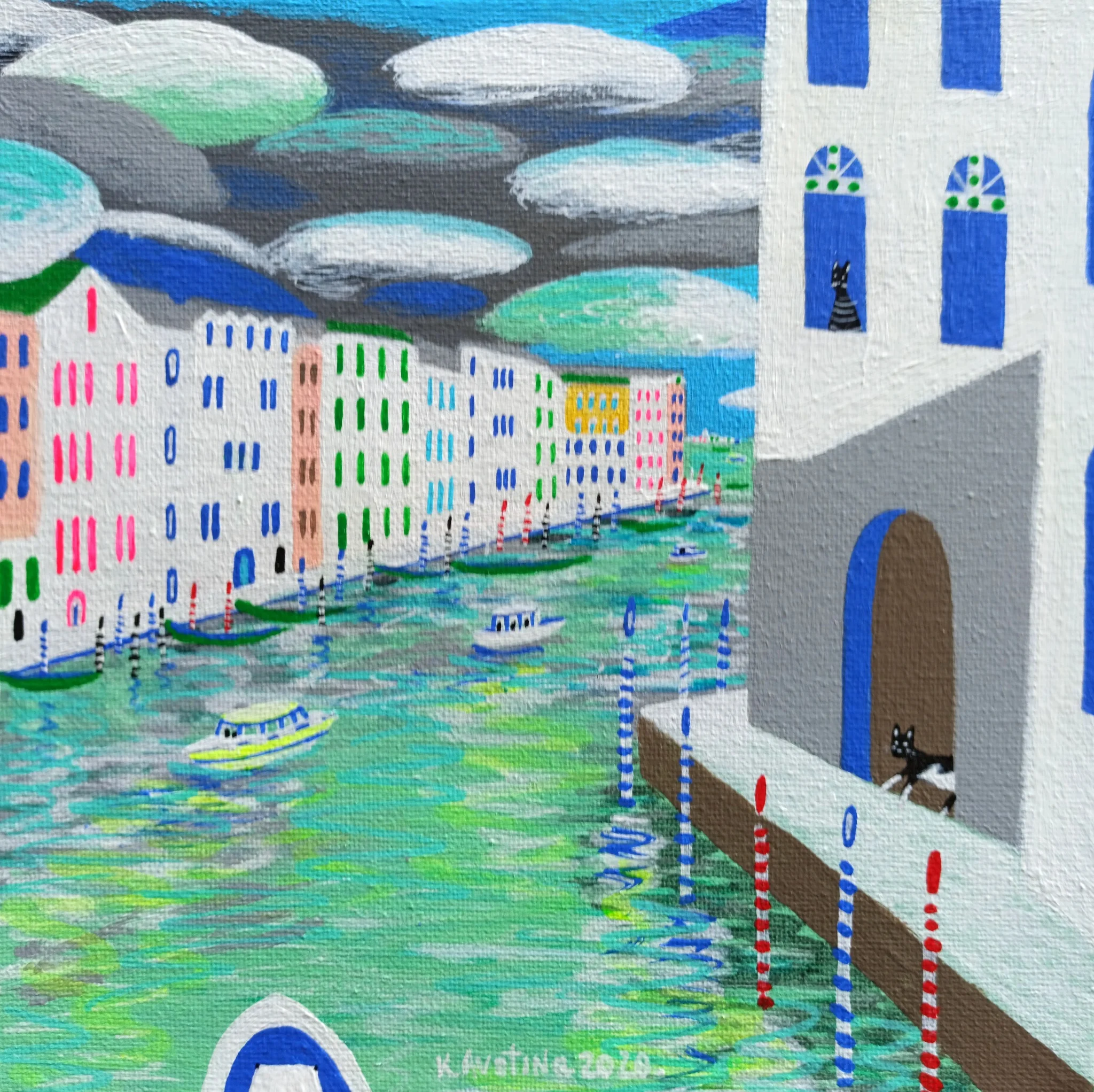 The artist’s signature soft blues and greens, accented with pastel highlights, create a serene and nostalgic atmosphere, reminiscent of Venice’s timeless beauty. The detailed reflections on the water, the soft movement of boats, and the tiny yet expressive figures—including a curious black cat—add a touch of enchantment to the scene. The play of light and shadow in the sky, with its textured clouds and shifting tones, enhances the painting’s tranquil and romantic essence.