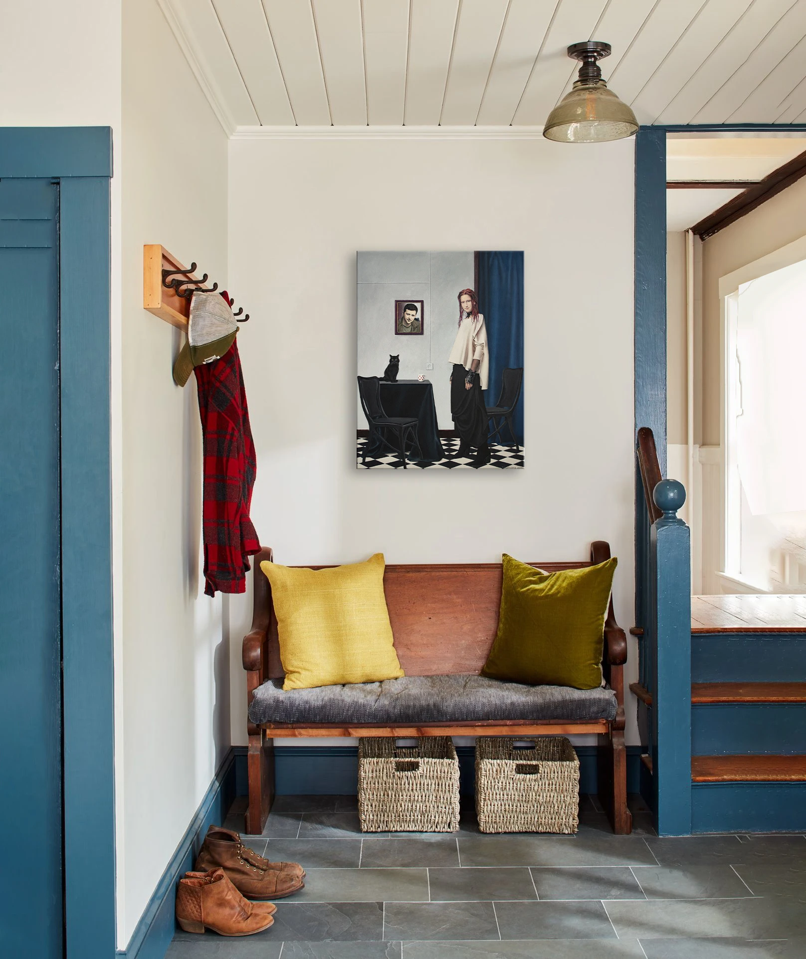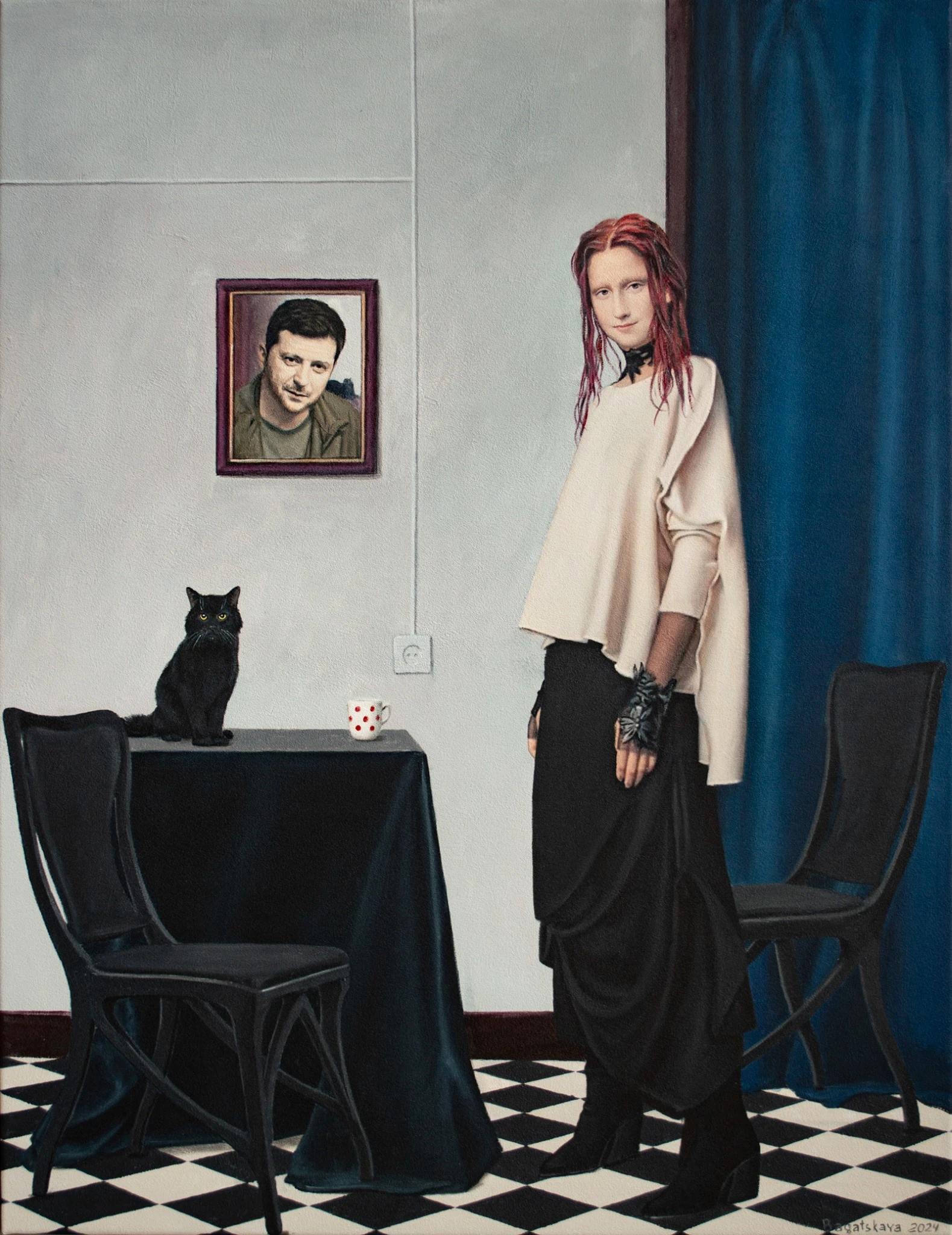“Coffee with the President” by Nataliya Bagatskaya merges realism, symbolism, and gentle surrealism in a figurative composition filled with personal narrative. A lone woman stands composed yet informal, next to a black cat seated at a darkened table. The space is quiet and minimal—yet the framed portrait of the president on the wall adds weight and meaning. Is this scene a fantasy? A statement? A dialogue? This artwork evokes dreams, solitude, and the quiet power of imagined moments. Painted with Dutch acrylics and fine Italian canvas, and finished in satin varnish, this piece is part of the “Life in Avatar” series. Its clarity, contrast, and mood make it a compelling choice for thoughtful interiors.