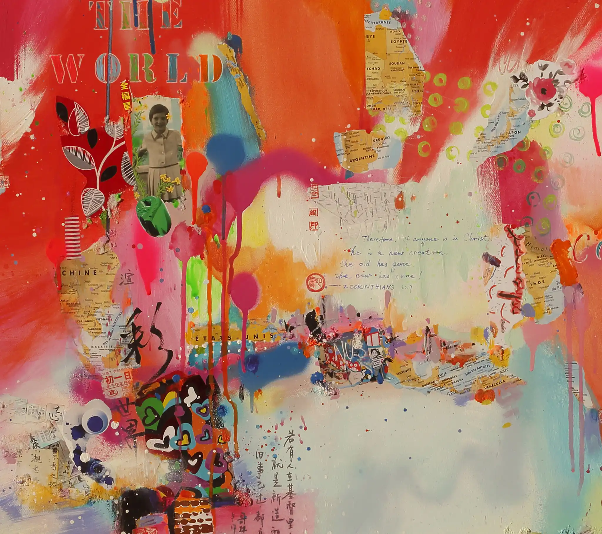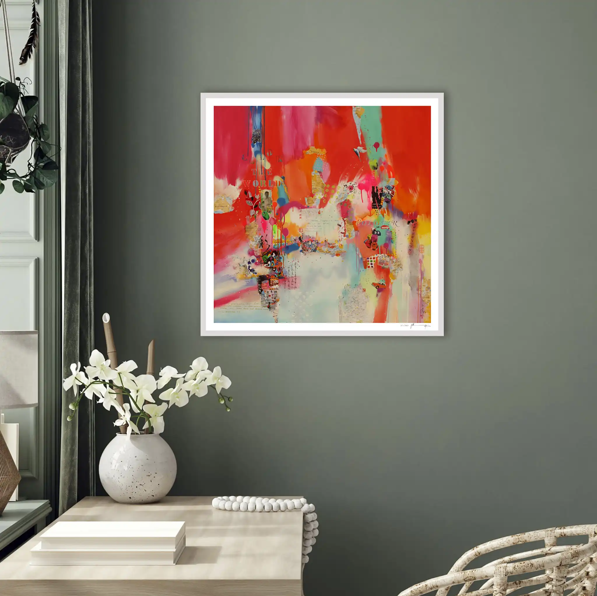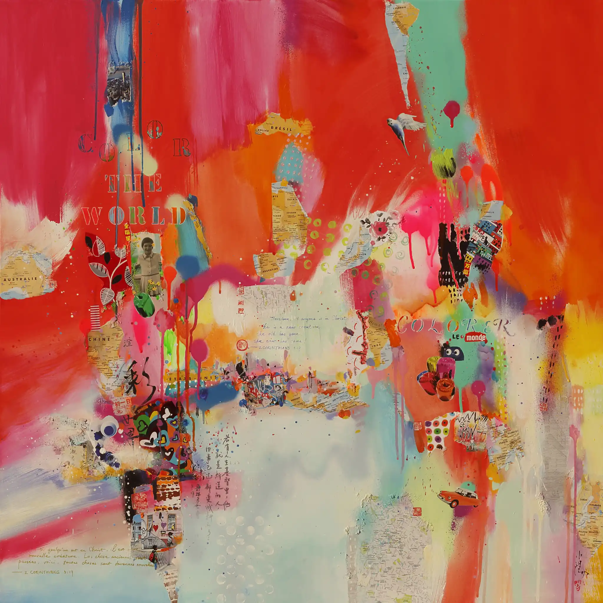 Signed and numbered by the artist, it is a collector's treasure in a series of 30. Through bold splashes of color and intricate collage elements, Galas invites viewers into a world where East meets West. The inclusion of layered calligraphy in Chinese, French, and English, alongside motifs of global maps and cultural symbols, speaks to her artistic philosophy of bridging divides. The palette is a medley of warm reds and oranges juxtaposed with soothing blues and yellows, echoing themes of optimism and balance. Galas' mixed-media technique combines acrylics, oils, and collaged materials, lending the artwork a dynamic and textured aesthetic. "Color the World" radiates joy and inspiration, reminding us of the beauty in diversity. It’s an ideal centerpiece for spaces such as living rooms, creative studios, or modern offices, where its vibrant energy can uplift and spark conversation. This artwork beautifully encapsulates the artist's mission: to spread messages of love, peace, and the enduring beauty of our shared world.