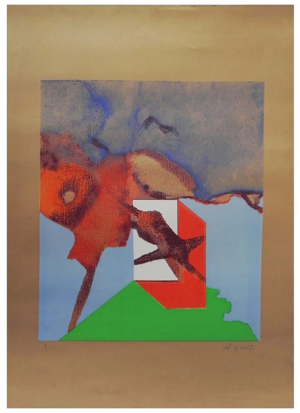 The lithography embodies Givati’s signature style, influenced by his experiences in various cultures and his studies with renowned painter Marcel Janco. The vivid orange and red forms interact with the tranquil blue background, evoking a sense of balance and motion. This interplay of organic and geometric elements, set against a dreamlike atmosphere, reflects the artist's profound engagement with the abstract.