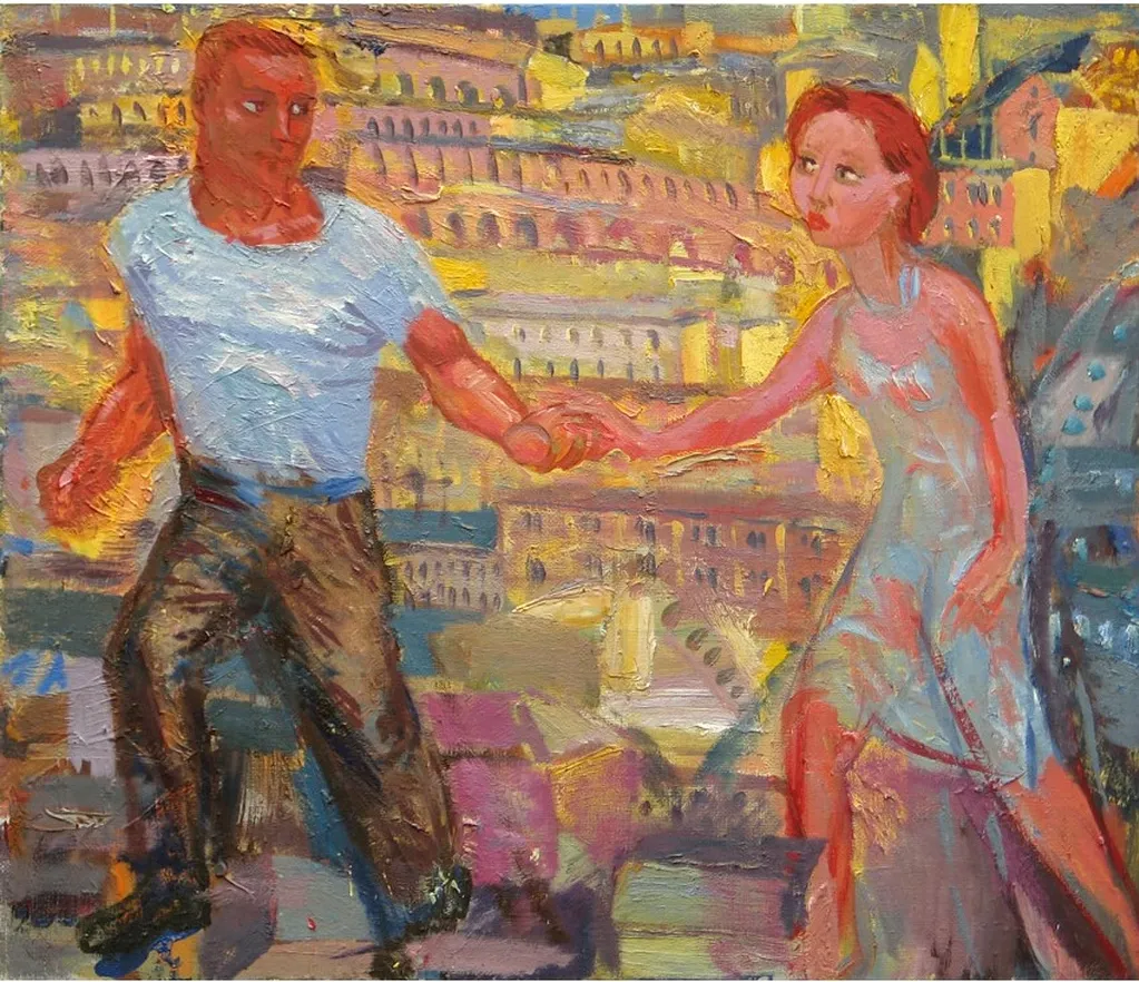 The painting presents a man and a woman reaching out to each other, their gazes filled with longing and determination. Set against a cityscape bathed in warm, earthy yellows and reds, the figures stand out with their expressive gestures, symbolizing both passion and uncertainty.