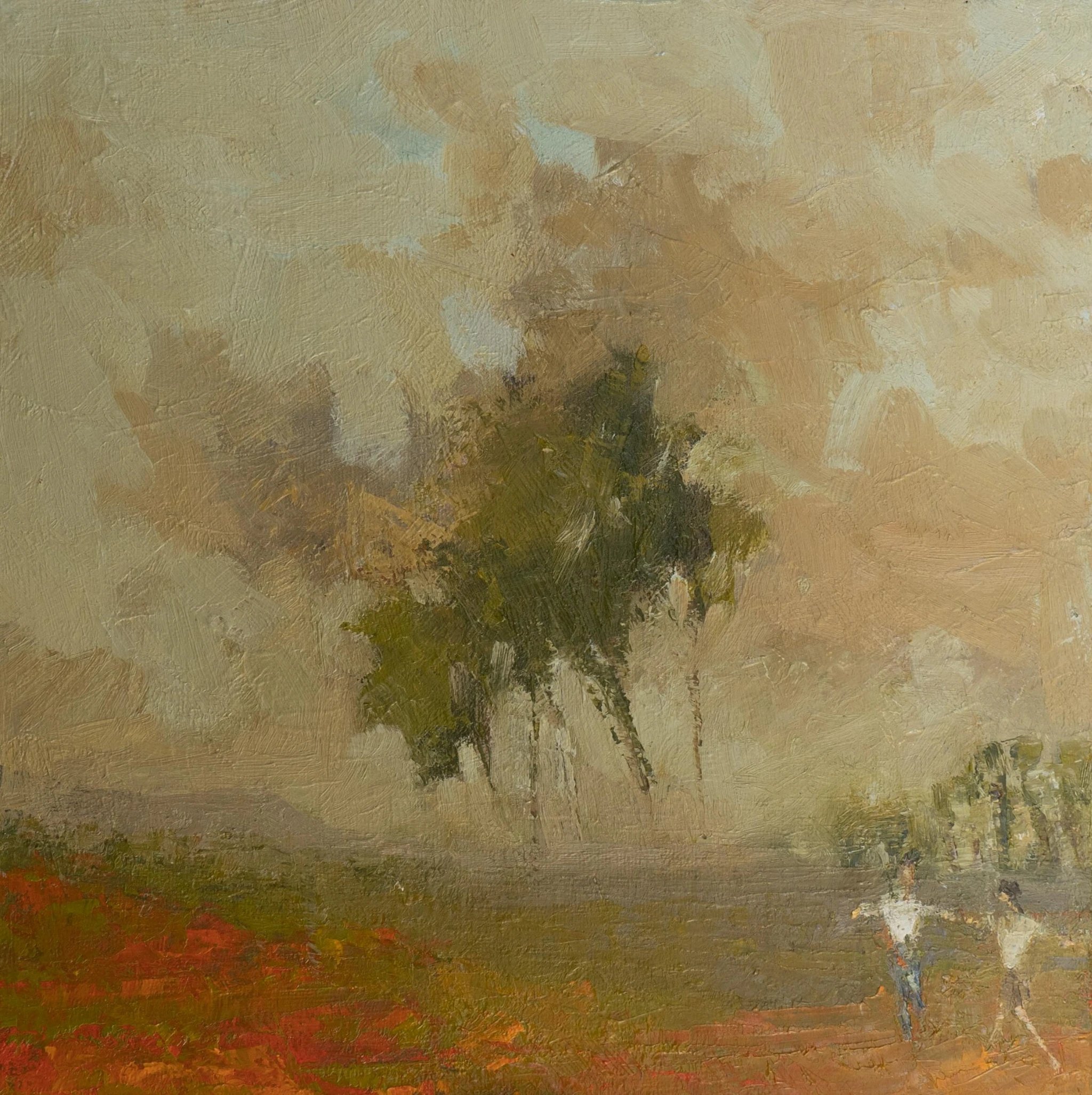 Measuring 30 cm × 30 cm, this impressionistic work blends earthy tones of beige, ochre, and burnt orange with muted greens and subtle blues, creating a dreamlike and nostalgic atmosphere. The painting captures a fleeting moment of joy as a couple moves freely across a golden field, framed by towering trees that sway gently in the breeze.