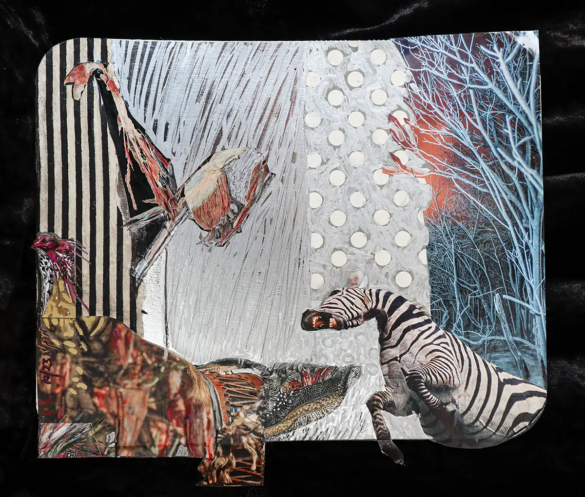 A chaotic and vivid collage, where the animal kingdom meets abstract patterns, invoking a sense of surreal disarray.