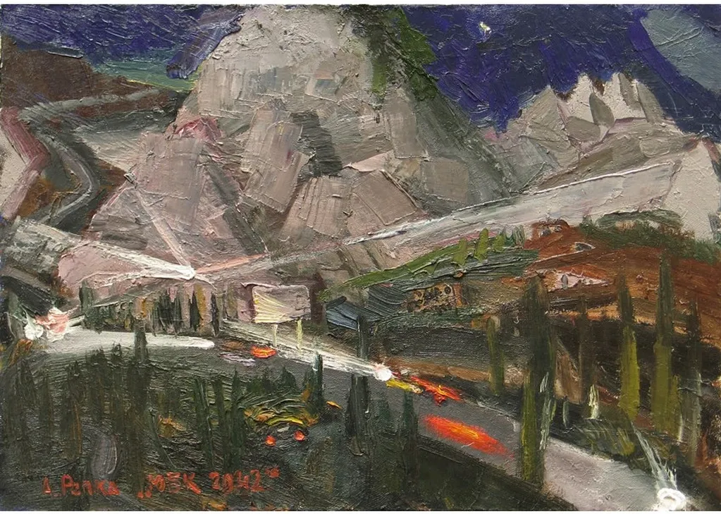 Repka’s post-impressionist brushwork brings an energetic, almost sculptural quality to the rugged terrain, while deep blues and earthy browns contrast with glowing red and orange lights from passing cars. The painting pulses with a sense of mystery and contemplation—offering a glimpse into a landscape that is both familiar and yet eerily futuristic. The dramatic night sky and streaks of moving headlights enhance the dreamlike quality, immersing viewers in a vision of time in flux.