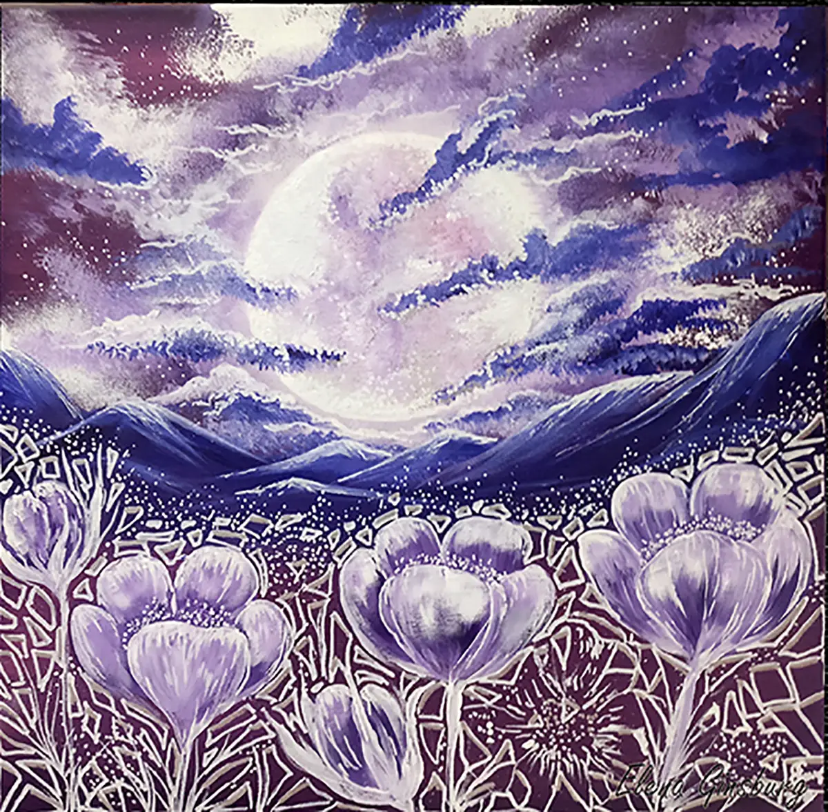"Crocuses Valley" captures an enchanting nocturnal scene with a radiant full moon illuminating a valley of ethereal crocuses, set against a backdrop of majestic mountains. The painting employs a cool color palette, predominated by various shades of purple and blue, enhancing the nighttime mood. The light from the moon casts a soft glow, creating subtle lighting effects that highlight the texture and detail of the crocuses and the swirling sky. The artist, Yelena Ginsburg, uses an impressionistic style with elements of Art Deco, evident in the stylized forms of the flowers and the decorative patterns of the landscape. The overall mood is tranquil and contemplative, designed to evoke feelings of calm and wonder, aligning with the artist's vision of revealing the beauty of the world through art. This piece would beautifully complement a setting that appreciates reflective and soothing artworks, such as a bedroom, study, or a meditative space.