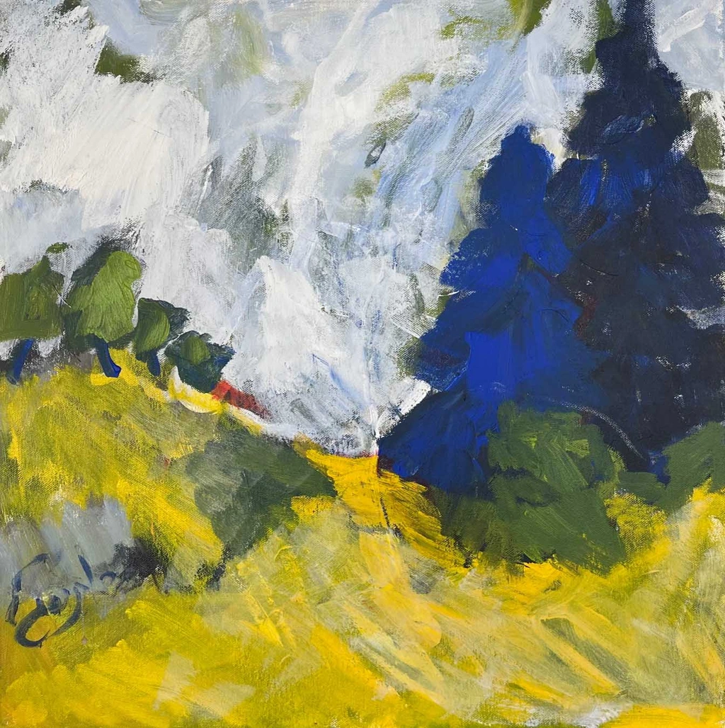 Measuring 50 cm x 50 cm, this vibrant piece is a harmonious blend of impressionist and abstract-expressionist techniques. The artist uses a bold palette of yellow, green, and blue, accented with subtle whites and earthy tones, to depict a lively natural scene featuring towering cypresses.
