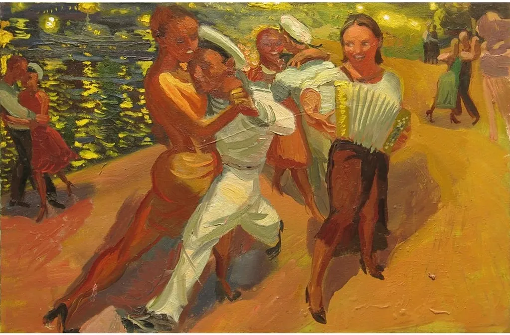 The painting bursts with warm yellows, fiery reds, and deep blues, blending together in a radiant contrast of light and shadow. The loose, expressive brushstrokes bring the figures to life, allowing their movements to flow effortlessly across the canvas. The central couple, locked in a passionate embrace, exudes a sense of connection and rhythm, while the accordion player adds to the dynamic energy of the scene. In the background, additional dancers and onlookers contribute to the sense of a community brought together by the universal language of music and dance.