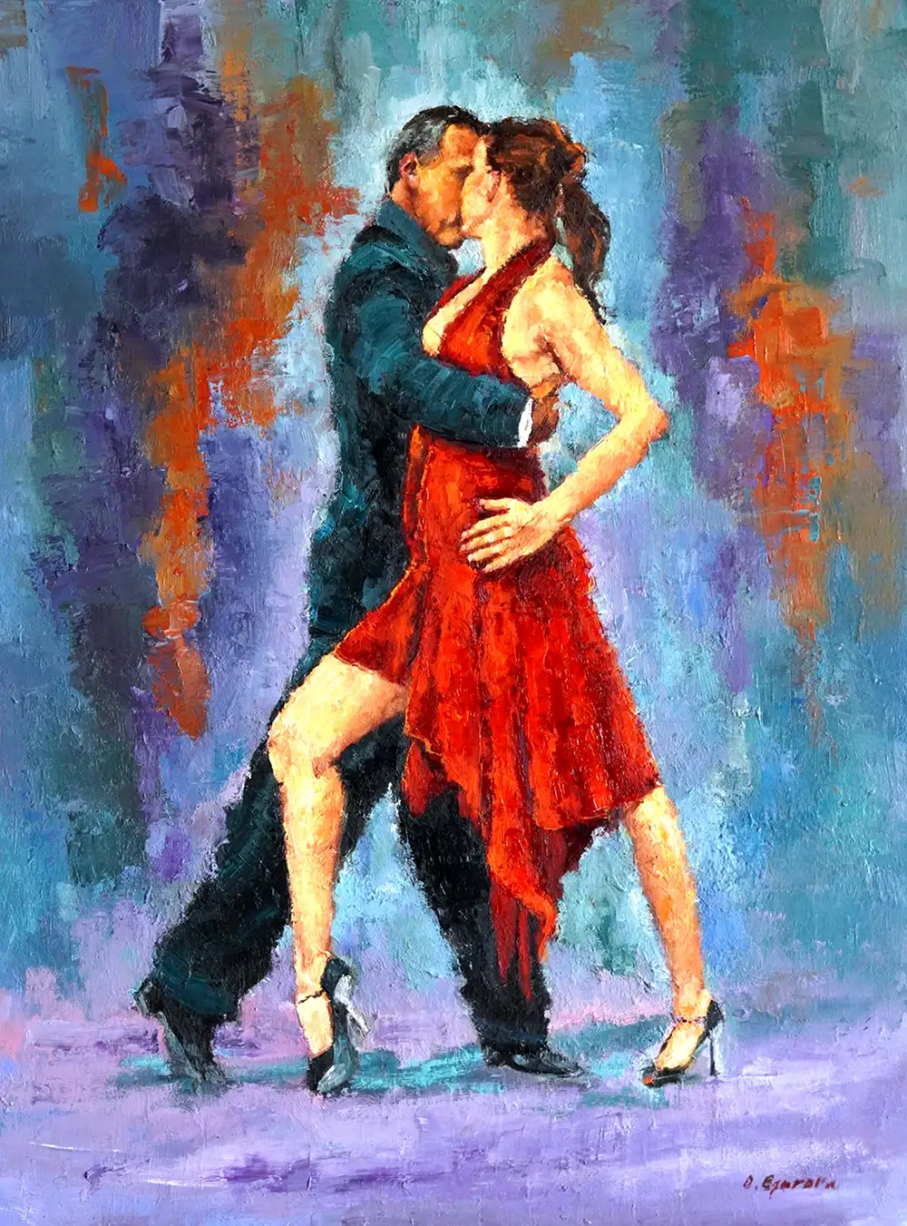 In this emotive piece, Olga Egorov celebrates the intimate connection of dance with a couple lost in a tango's embrace. The dancers' movement is rendered with dynamic brushstrokes that emphasize the flow of the dance and the vivid red dress that stands out against the cool, abstract background. This artwork exudes the passion and rhythm of the moment, making it an ideal choice for spaces that wish to convey motion and emotion, such as a dance studio, a living room, or a performing arts center.