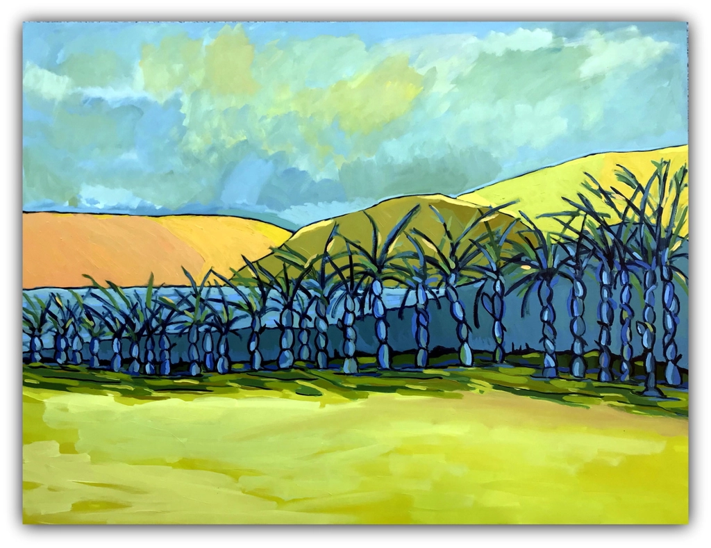 Jackie Sternberg’s figurative style, combined with contemporary techniques, emphasizes the contrasts between the lush greenery, sandy yellows, and deep blues of the scene. Measuring 90 cm x 120 cm, this artwork creates a harmonious and tranquil atmosphere, making it an excellent choice for large living spaces, offices, or entryways. Sternberg’s mastery of color and composition breathes life into this striking portrayal of nature.