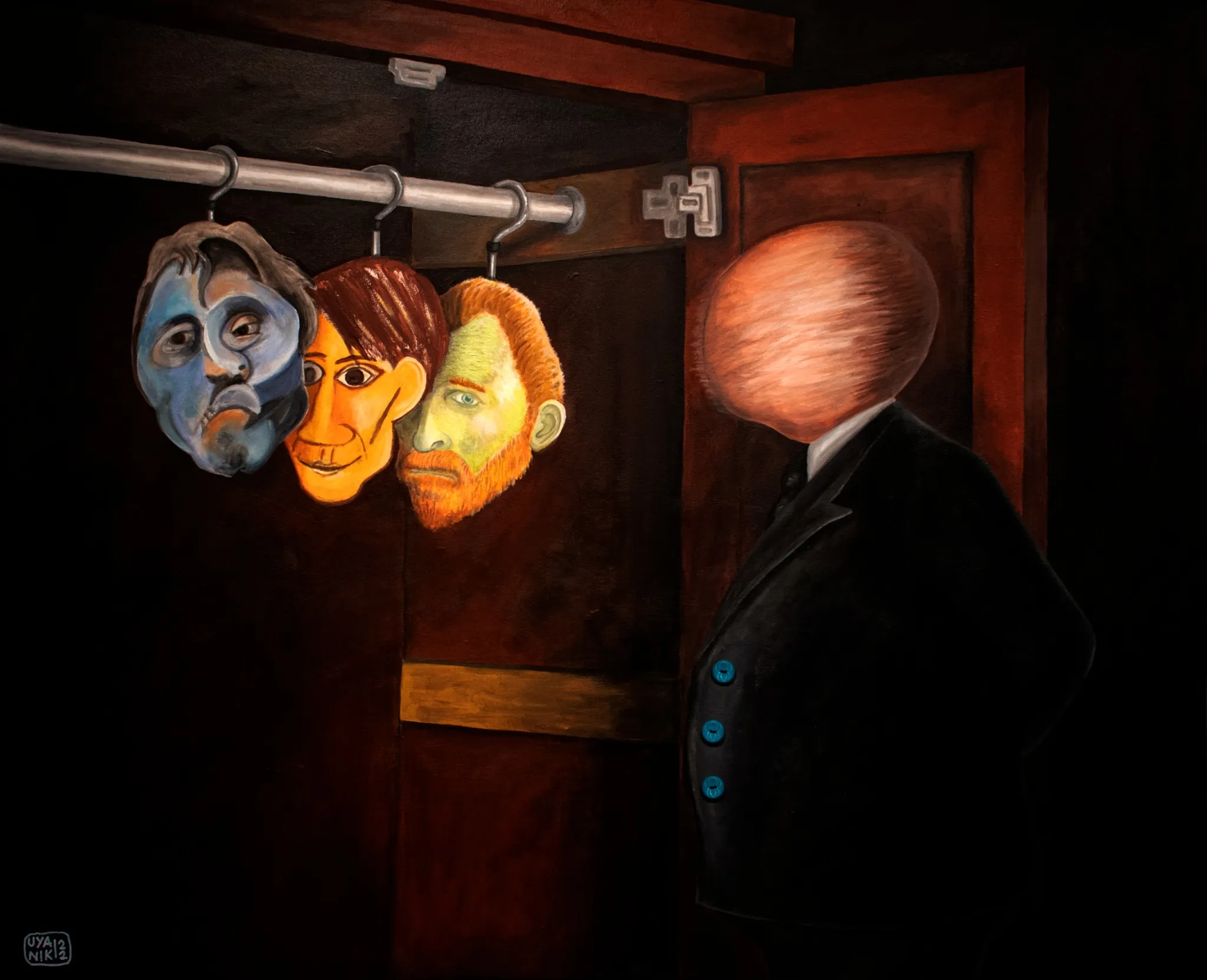 This surrealist work, rendered in a muted color palette of browns and blacks with striking highlights of blue and orange, captures a mysterious narrative. The faceless figure and hanging masks evoke questions about the roles we play and the choices we confront in life.