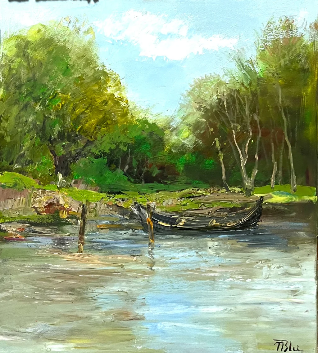 A lone wooden boat, gently moored at the river’s edge, adds a touch of human presence, evoking a sense of tranquility and quiet contemplation. The scene is bathed in soft natural light, creating a harmonious blend of cool blues, earthy browns, and lush greens, making the painting feel both refreshing and dreamlike.