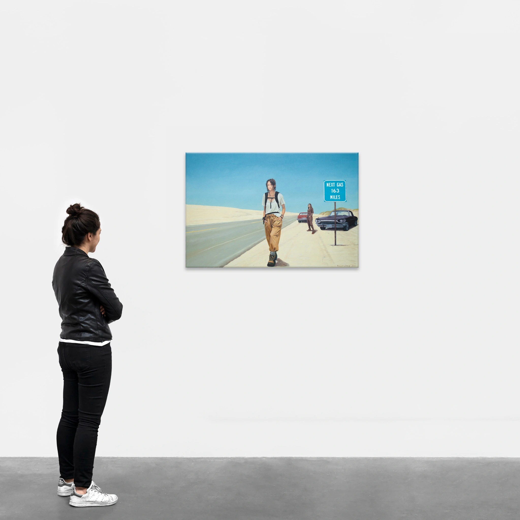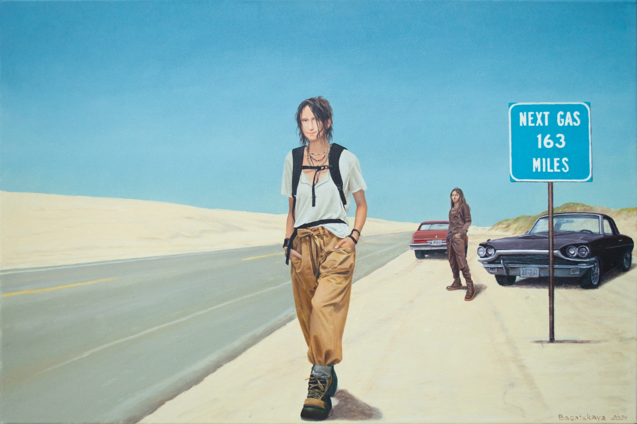 Dilemma by Nataliya Bagatskaya captures a cinematic moment of introspection on a deserted roadside. A young woman strides with resolve under a bold blue sky, passing a sign that warns "Next Gas 163 Miles"—a powerful symbol of choices and consequences. Behind her, two classic cars and a figure in the distance deepen the ambiguity and narrative tension. Part of the Life in Avatar series, this acrylic work blends realism with narrative power, evoking themes of freedom, isolation, and personal journey.