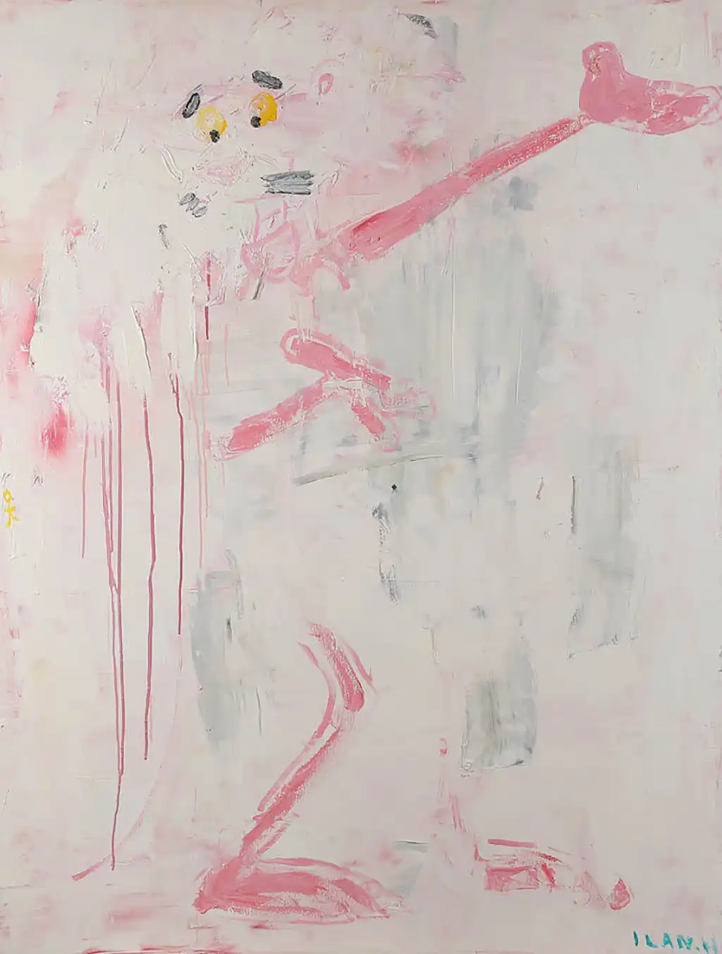 The artwork, with its ghostly depiction of a figure reminiscent of the Pink Panther, veers away from the traditional vibrancy associated with the character, opting instead for a muted palette of whites, pinks, and grays. This choice of colors, combined with the character’s faint and almost obscured appearance, evokes feelings of confusion and loss, as if the image is struggling to maintain its presence on the canvas. The expression of the character, with its barely discernible face and elongated arm, adds to the eerie, almost ghostly quality of the piece. “Disp” is more than just a visual representation; it is a statement on the distortion of nostalgia and the complexity of cultural symbols. By distorting these icons in unexpected ways, Halfon invites the viewer to question the seemingly harmless images of their childhood and confront the underlying cultural narratives that shape their understanding of the world. The painting's subdued yet unsettling atmosphere makes it a compelling piece for modern and contemporary settings, particularly spaces that benefit from thought-provoking art that sparks conversation. Whether displayed in a gallery, an office, or a private collection, "Disp" serves as a reminder of the dualities present in both art and life – where the line between innocence and darkness, humor and critique, is often blurred.