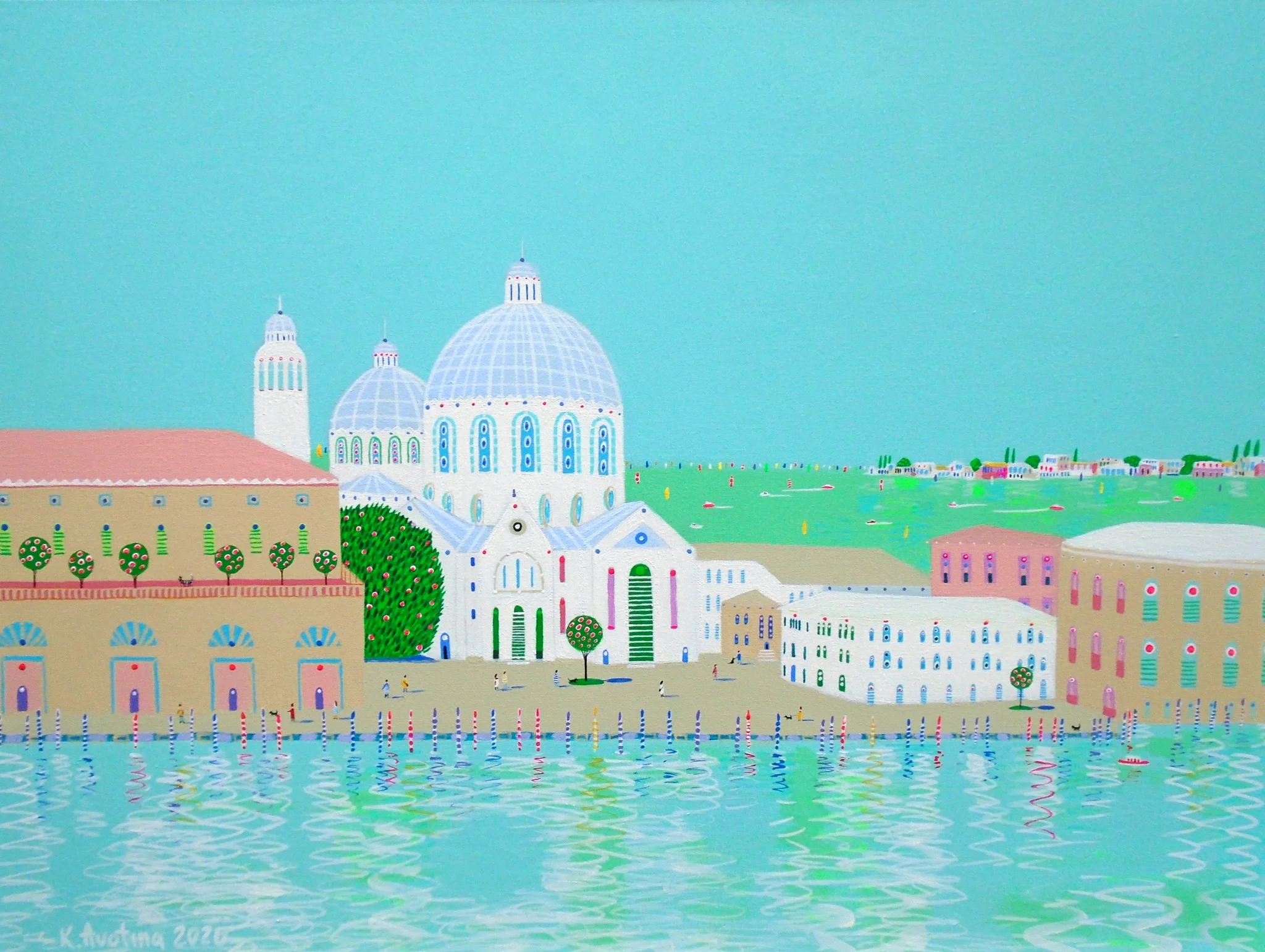 The painting features a luminous turquoise sky, a reflective body of water, and intricate architectural elements bathed in soft pastels. The domed cathedral, flanked by elegant buildings, stands as the centerpiece, exuding a sense of grandeur and peace. Tiny human figures add life to the composition, evoking a world full of charm and wonder. Katrina Avotina’s meticulous detailing and joyful color palette create a scene that feels timeless yet contemporary, reminiscent of the works of Hundertwasser and Matisse.