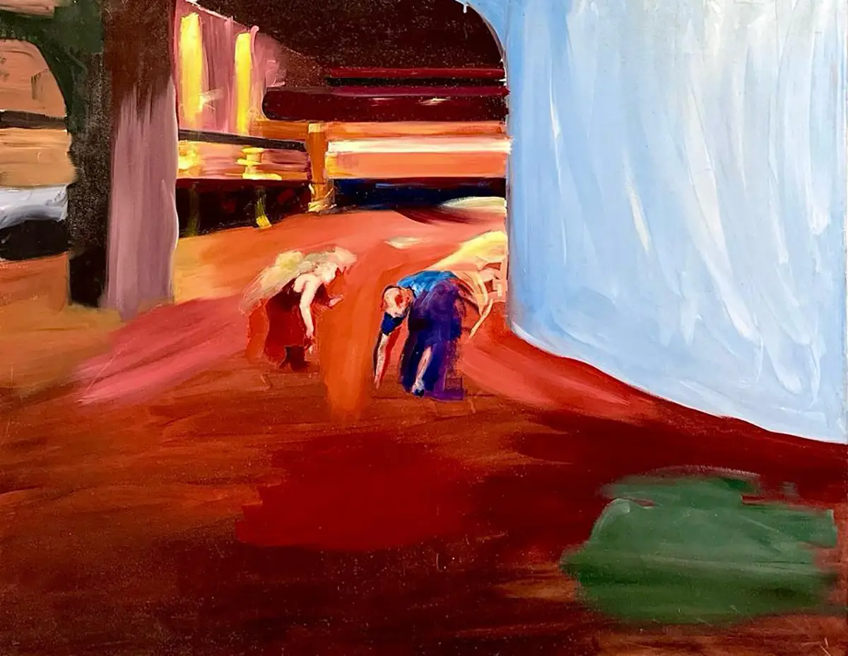 An abstract scene with vibrant colors depicting two figures bending over in an urban interior, likely the bustling Dizengoff Center. The dynamic lighting and expressive brushstrokes create an intense, lively mood.