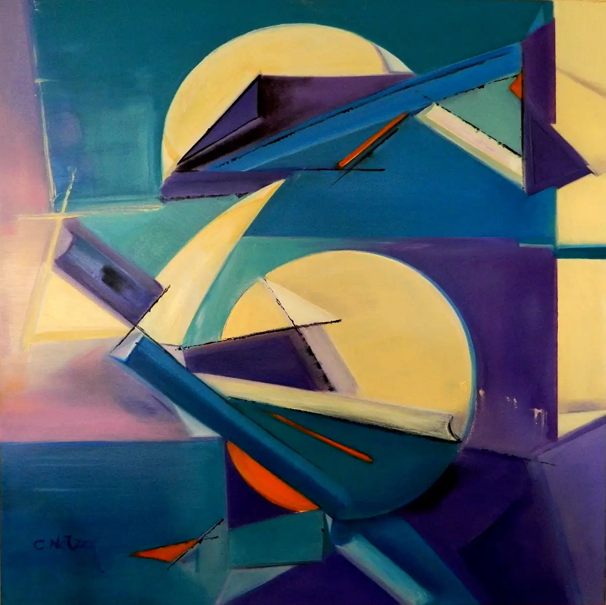In "Dreaming About 2 Moons", Clari Netzer explores the realm of celestial fantasy through her abstract lens. The painting features ethereal spheres reminiscent of moons, set against a backdrop of tranquil blues and mystical purples, with geometric accents that add depth and intrigue. This 80x80 cm artwork is a portal to the subconscious, inviting viewers to ponder the mysteries of the cosmos and the vastness of dream worlds. Ideal for reflective spaces such as a study, a reading nook, or a night-time retreat, Netzer's painting encourages a pause from the everyday and a journey into the imagination.