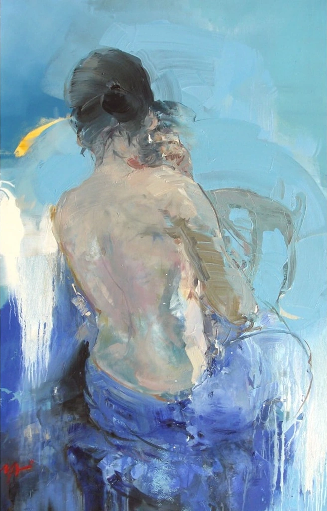 This masterpiece offers a dreamy interplay of soft blues, creamy whites, and golden accents that create an intimate yet reflective atmosphere. Inspired by Maksymenko’s ability to see joy in fleeting moments, this piece vividly portrays the subtle sensuality of a seated woman, lost in thought, with her back turned to the viewer.