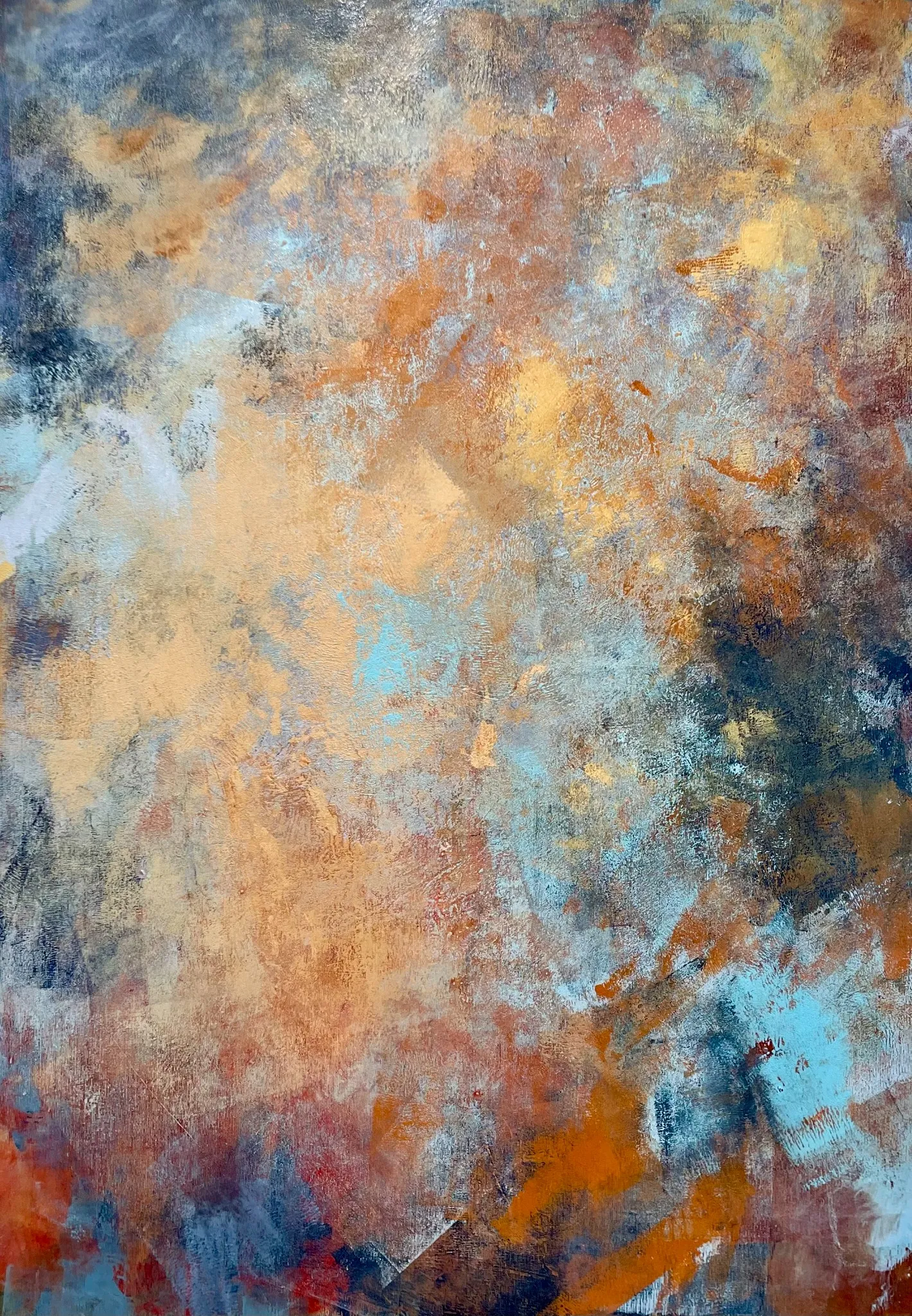 Electric bursts with kinetic energy, vibrating through layers of saturated oranges, smoky blues, and muted rust. Miri Baruch translates pure emotion into form through a dynamic play of texture and movement. Each brushstroke feels like a spark, igniting a charged atmosphere of intuition and instinct. The painting pulses with life—restless, expressive, and alive with visual electricity. A bold testament to abstract power, Electric doesn’t whisper—it hums.