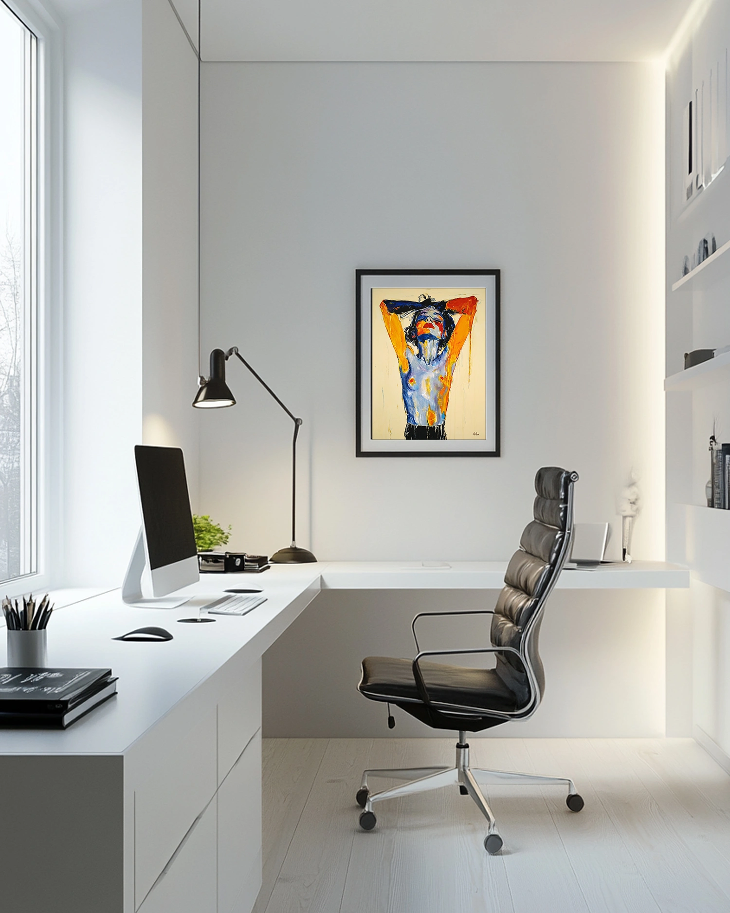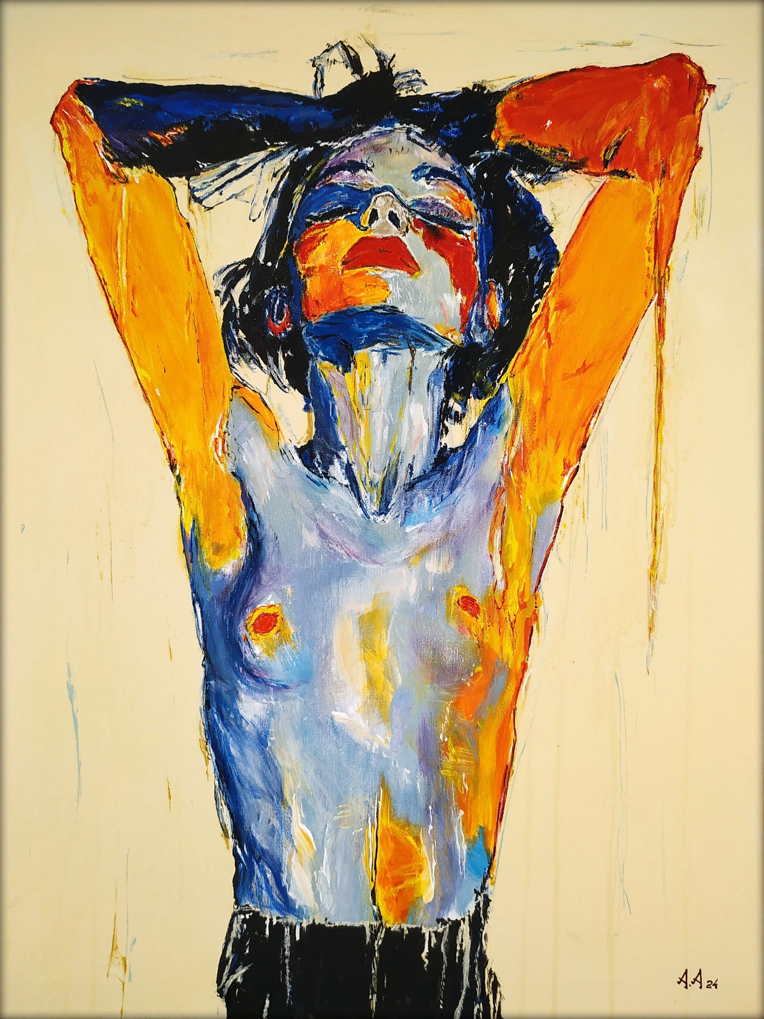 A powerful and emotive figurative painting, Embrace the Sky blends acrylic brilliance with expressive energy to portray a liberated female form. This contrasted, vibrant nude channels symbolic themes of pride, self-expression, and awe. Painted in 2024 with intense brushwork and bold color palette, the artwork radiates a freeing, intimate atmosphere—ideal for bedrooms, hallways, or any space that celebrates emotional depth and personal presence.
