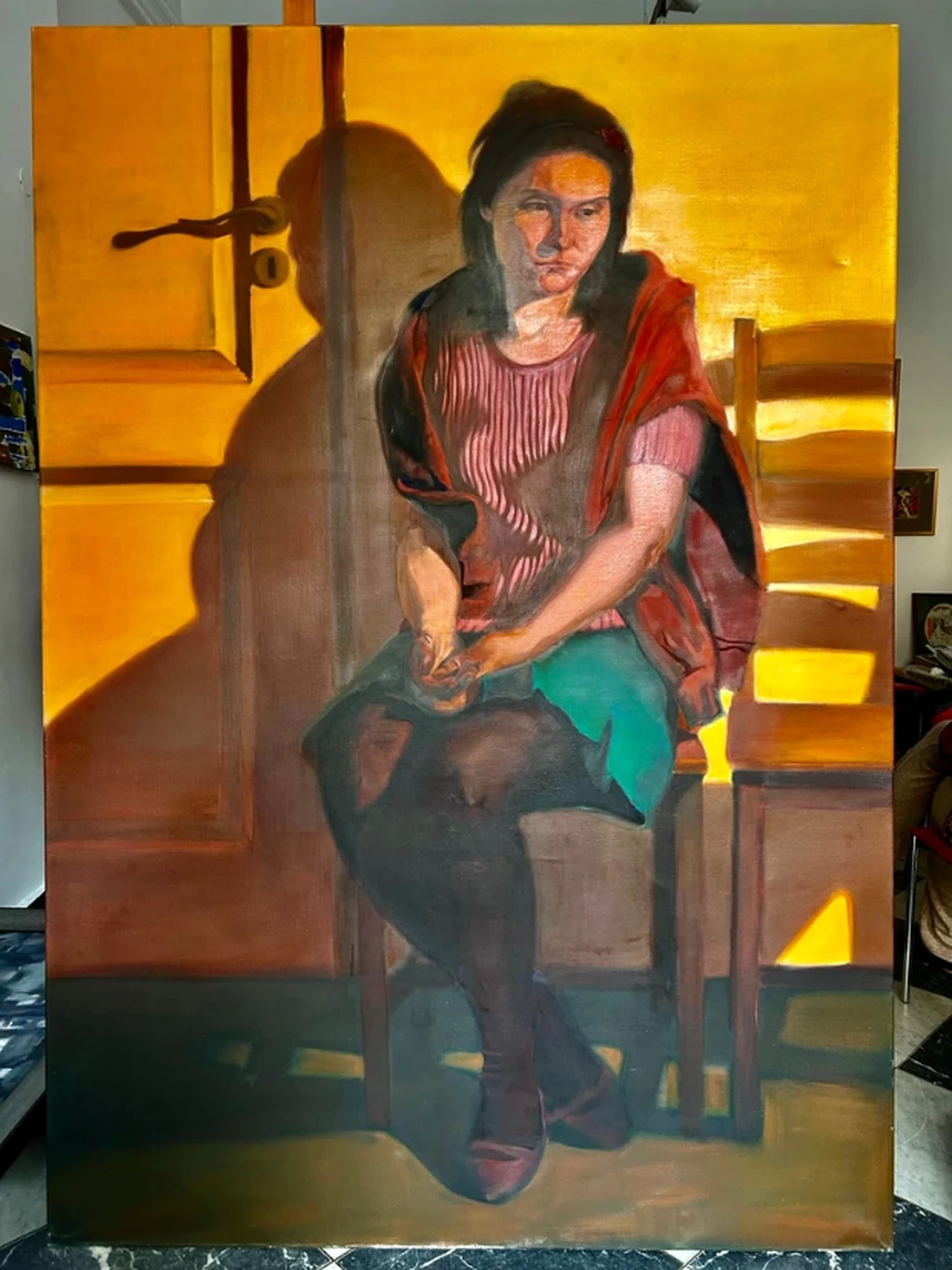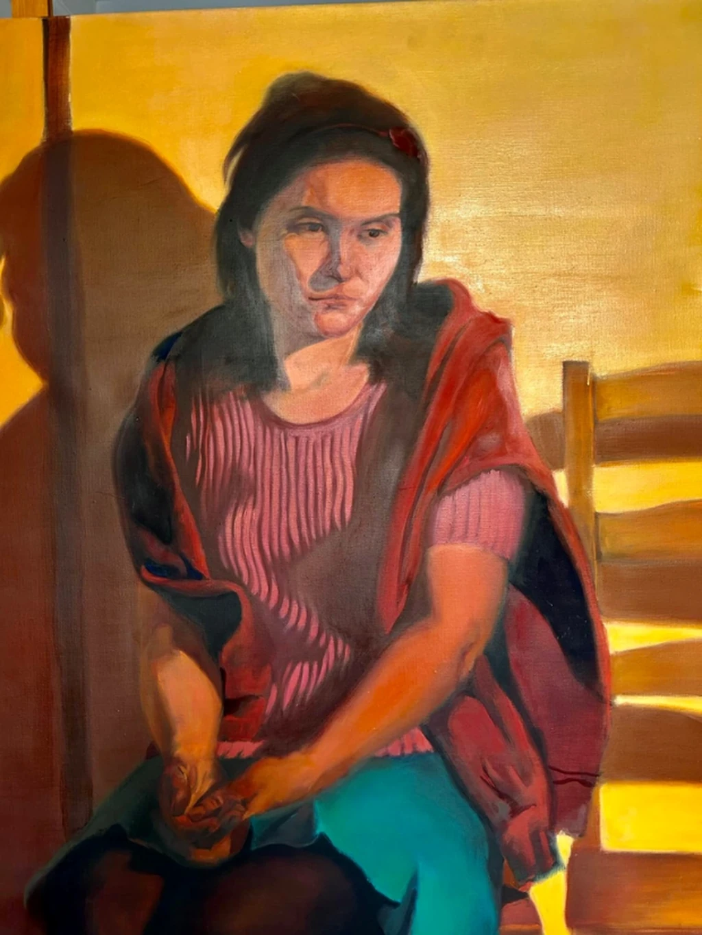 A woman sits in golden light, her expression pensive and shadowed. Norbert HEGEDŰS paints an intimate, expressive portrait full of emotional depth.