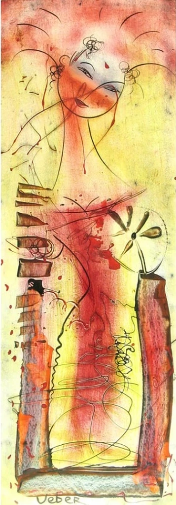Veber’s artistic technique blends abstraction with expressive movement, creating a sense of spontaneity and fluidity. The delicate yet energetic brushstrokes bring a lighthearted and carefree ambiance, making this piece a perfect addition to spaces meant for social interaction. The contrast between soft oranges and deep reds enhances the painting’s vibrancy, drawing the viewer into its festive atmosphere.