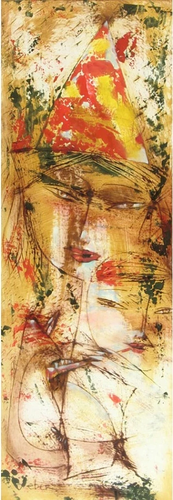 Veber’s distinctive abstract style allows the viewer to interpret the composition in multiple ways—perhaps as a musician lost in a melody or the intangible beauty of sound itself. The dynamic contrast between warm and earthy tones enhances the painting’s depth, drawing the viewer into its dreamlike atmosphere.