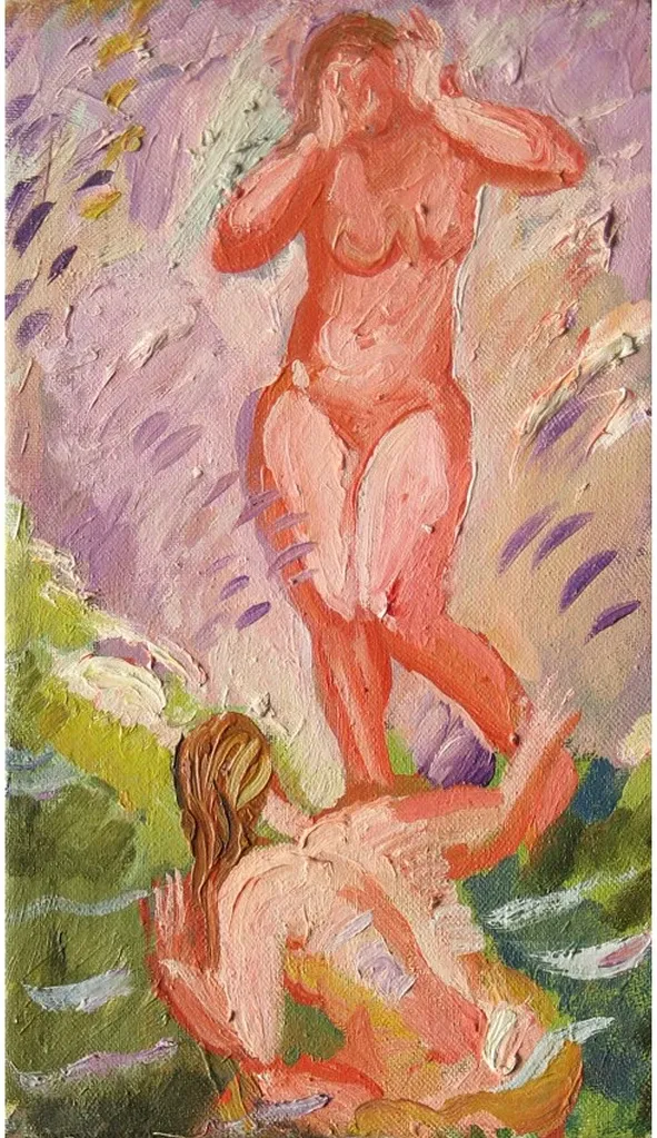 The central nude figures appear enveloped in a delicate, almost mystical glow, blending seamlessly with the impressionistic background. Repka's skillful use of color and form brings out a deep sense of tranquility and vulnerability, inviting contemplation. His extensive fine arts education, spanning from Ukraine to France, is evident in his ability to merge expressionist intensity with impressionistic softness.