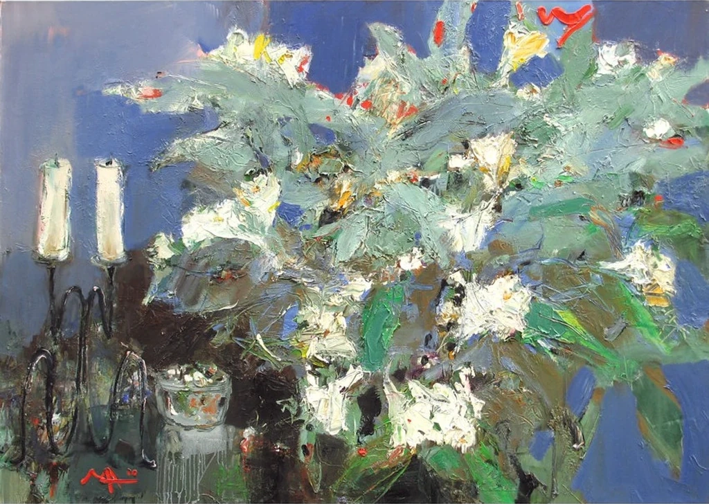 Subtle elements like the faintly lit candles and a delicately arranged table setting complement the floral theme, adding an intimate interior dimension. Maksymenko’s use of complementary colors and dynamic brushwork bring an energetic yet calming presence to the painting. The soft, muted tones contrast with bursts of vivid hues, portraying a balanced composition that inspires joy and calmness.