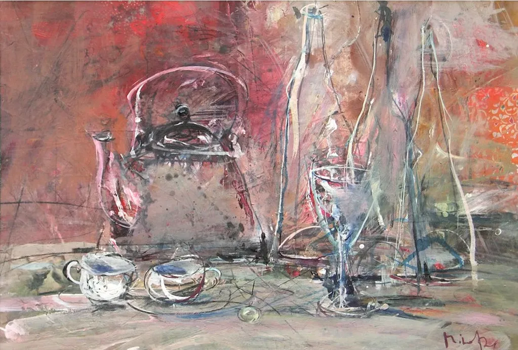 The artist’s dynamic brushstrokes and layered textures give this composition a dreamlike atmosphere, where glassware, teacups, and a kettle seem to dissolve into a rich, earthy palette of reds, browns, and soft blues.