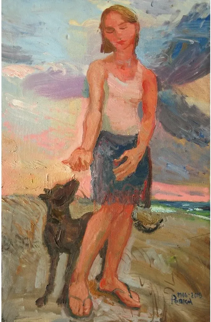 The woman, bathed in warm peach and coral tones, stands barefoot in the sand, her presence exuding serenity and reflection. The gentle gestures between her and the dog suggest trust and unspoken understanding, reinforcing the theme of companionship. Repka's ability to blend figurative and impressionistic elements results in a deeply emotional and contemplative piece.