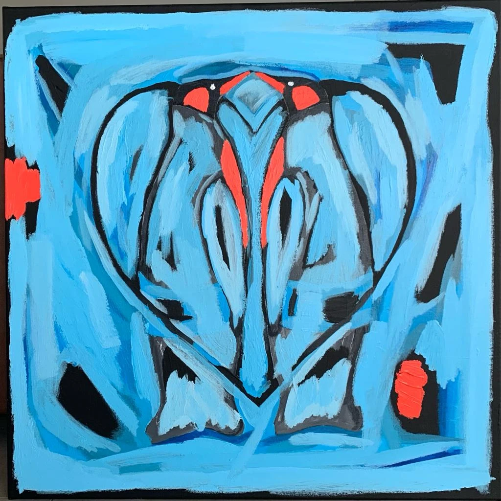 Measuring 70 cm × 70 cm and painted with acrylics on canvas, this piece showcases two abstractly rendered penguins, their forms intertwining to create a heart-like composition. The dominant blue and black tones provide a cool, immersive background, while bold red accents inject energy and passion into the scene.