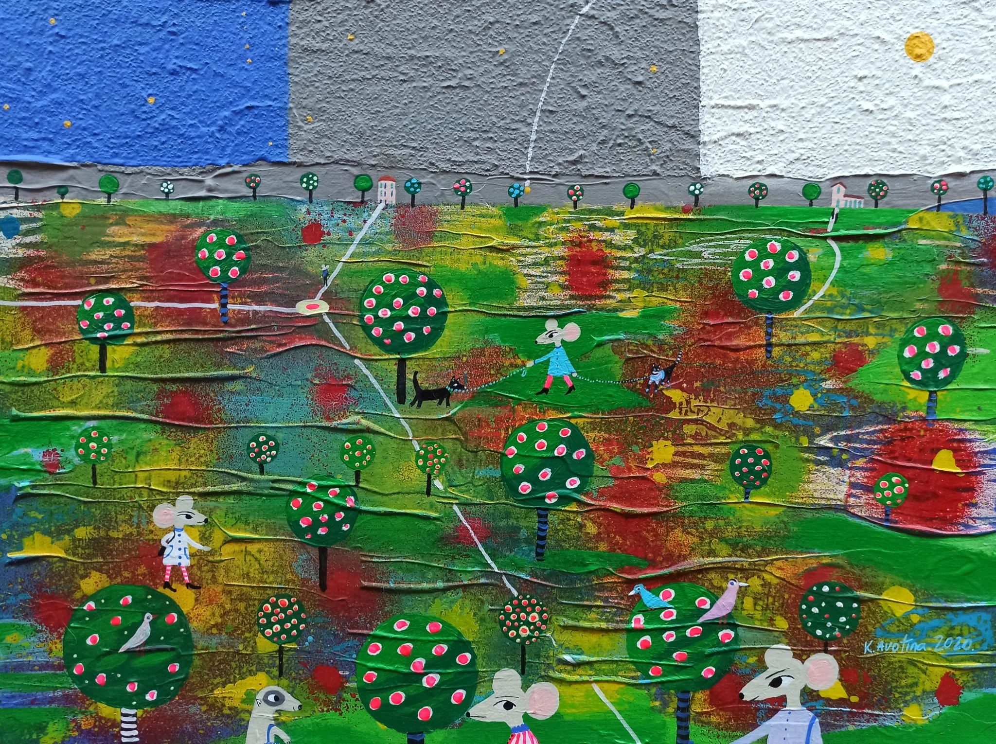 With a rich color palette of greens, reds, yellows, and blues, Avotina masterfully crafts a dreamlike setting where every brushstroke adds depth and movement. The use of layered textures enhances the vibrancy, making the scene feel almost alive. The playful mice, inquisitive cats, and friendly birds add a storybook-like quality, bringing out feelings of curiosity, happiness, and childlike wonder.