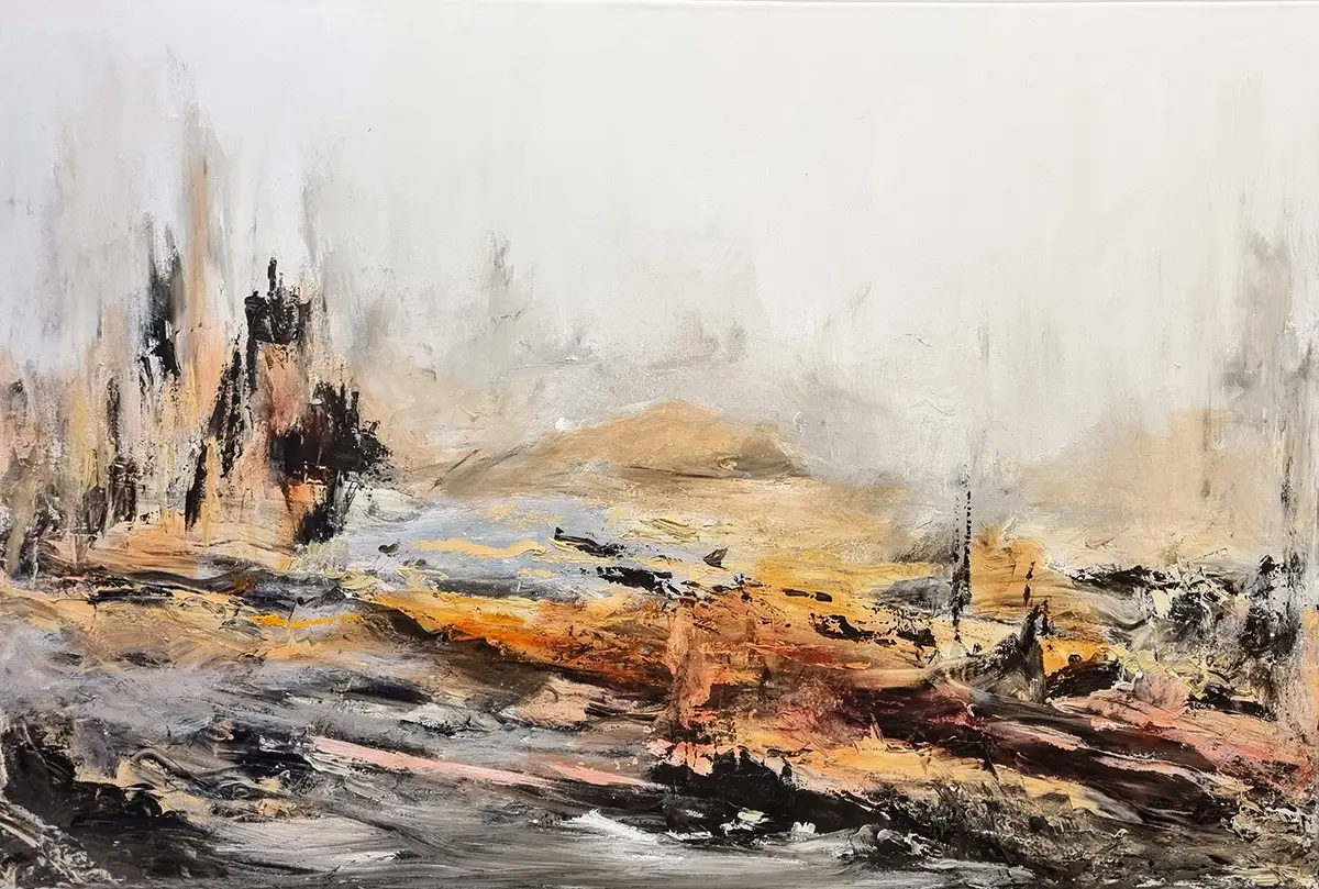 Annie Konforty's "F Land" is an evocative abstract piece, sized at 120 by 80 cm, where the stark contrasts of black and white are softened by the rich, warm earth tones that sweep across the canvas. This piece suggests a desolate yet striking landscape, perhaps the aftermath of a natural event or the quiet decay of a once-vibrant place. The textured application of paint creates an almost tactile sensation, allowing the viewer to feel the rough terrain. This artwork would resonate in a space that values contemplation and the beauty found in austerity, such as a minimalist living room or a modern office that embraces bold statements and reflective moods.