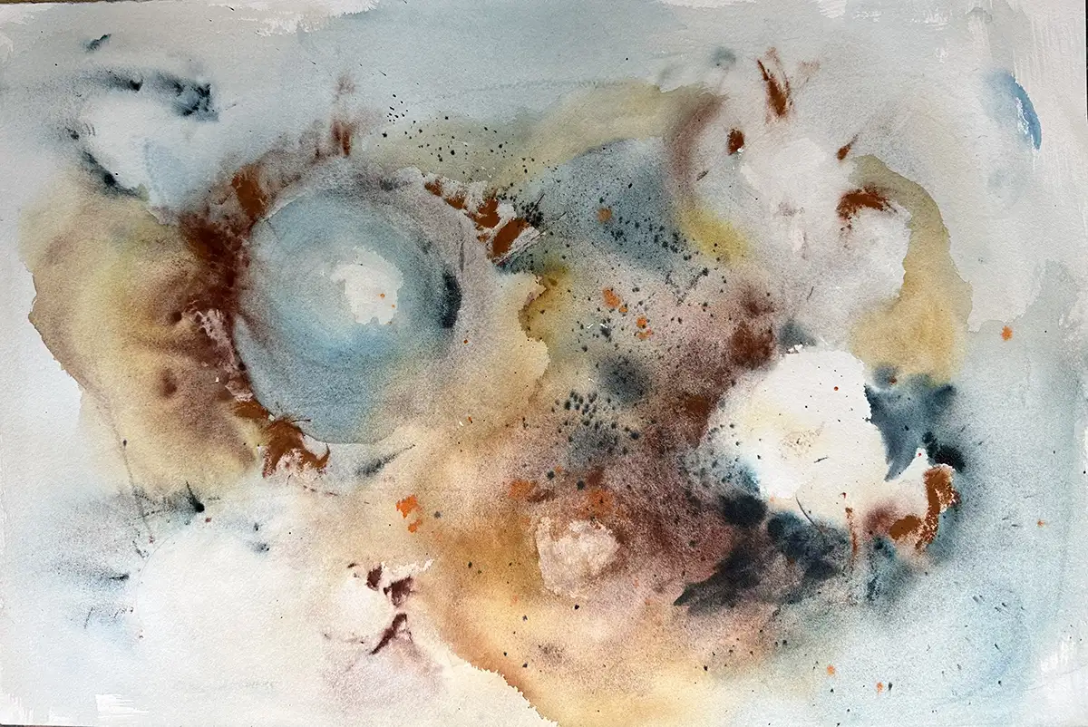 "Fantasy In Blue and Brown," floats between the realms of dreams and reality. The interplay of cool blues with warm browns and tans forms an abstract vista that suggests both the aerial view of a fantastical landscape and the microscopic intricacies of natural elements. The use of watercolors enhances the fluidity of the composition, where colors drift and converge in a delicate balance of spontaneity and control, characteristic of Inna Davidovich's technique. The style merges abstraction with hints of the surreal, resulting in a piece that stirs a subtle emotional response akin to observing natural phenomena. Ideal for spaces of introspection or creativity, this work can bring a sense of calm inspiration and profound depth.
