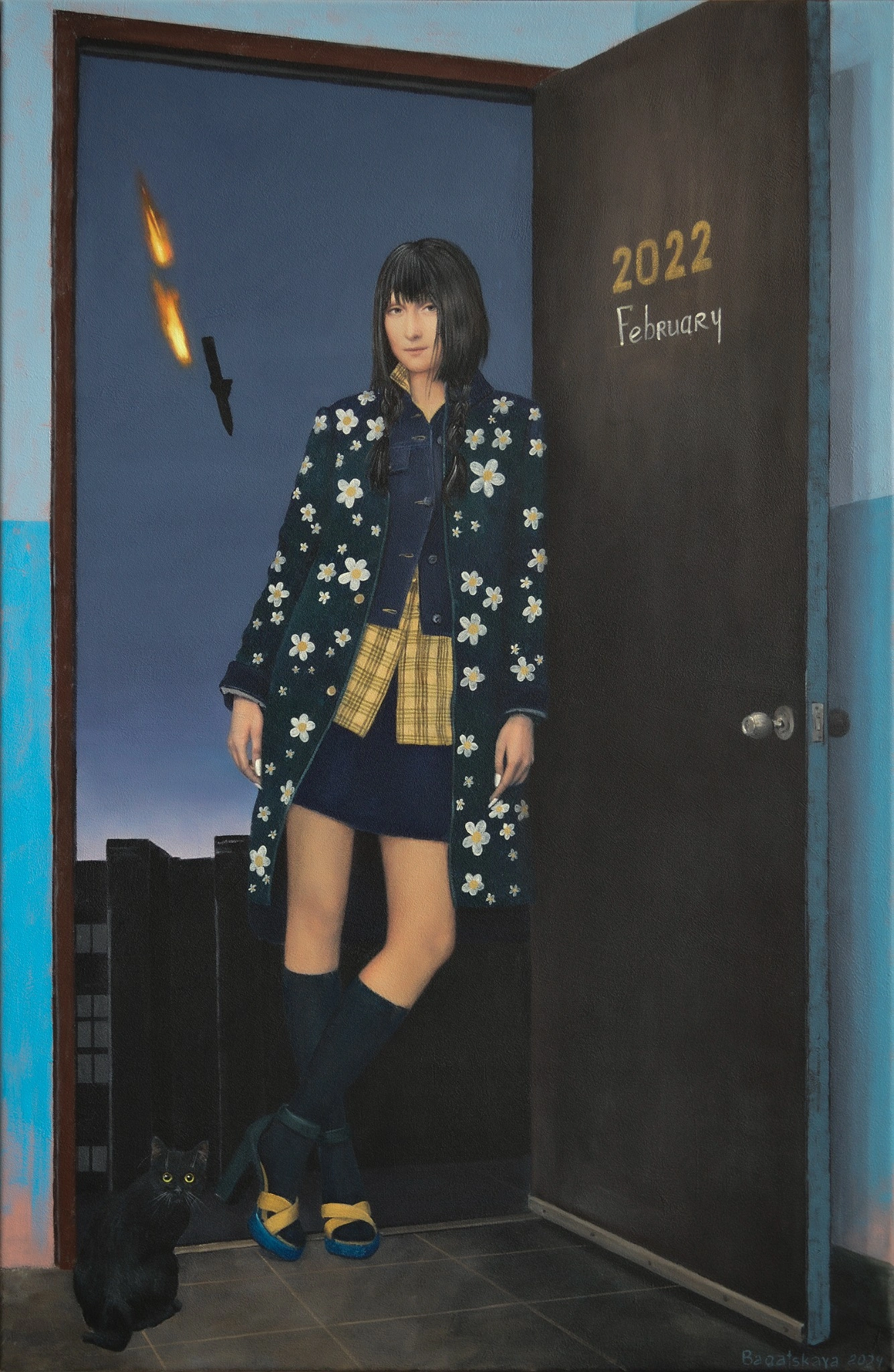 In February 2022, Ukrainian artist Nataliya Bagatskaya channels historical gravity into a personal, symbolic portrait. A poised woman stands in the frame of a door marked “February 2022,” while missiles blaze through the night sky behind her. Painted in acrylic with realist precision, this 100×65 cm artwork merges historical theme and dramatic mood through a carefully contrasted color palette. The painting’s emotional charge and silent defiance make it an impactful choice for thoughtful spaces such as a study, library, or reception area. A hauntingly beautiful visual echo of resilience and memory.
