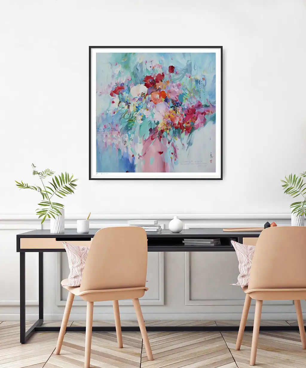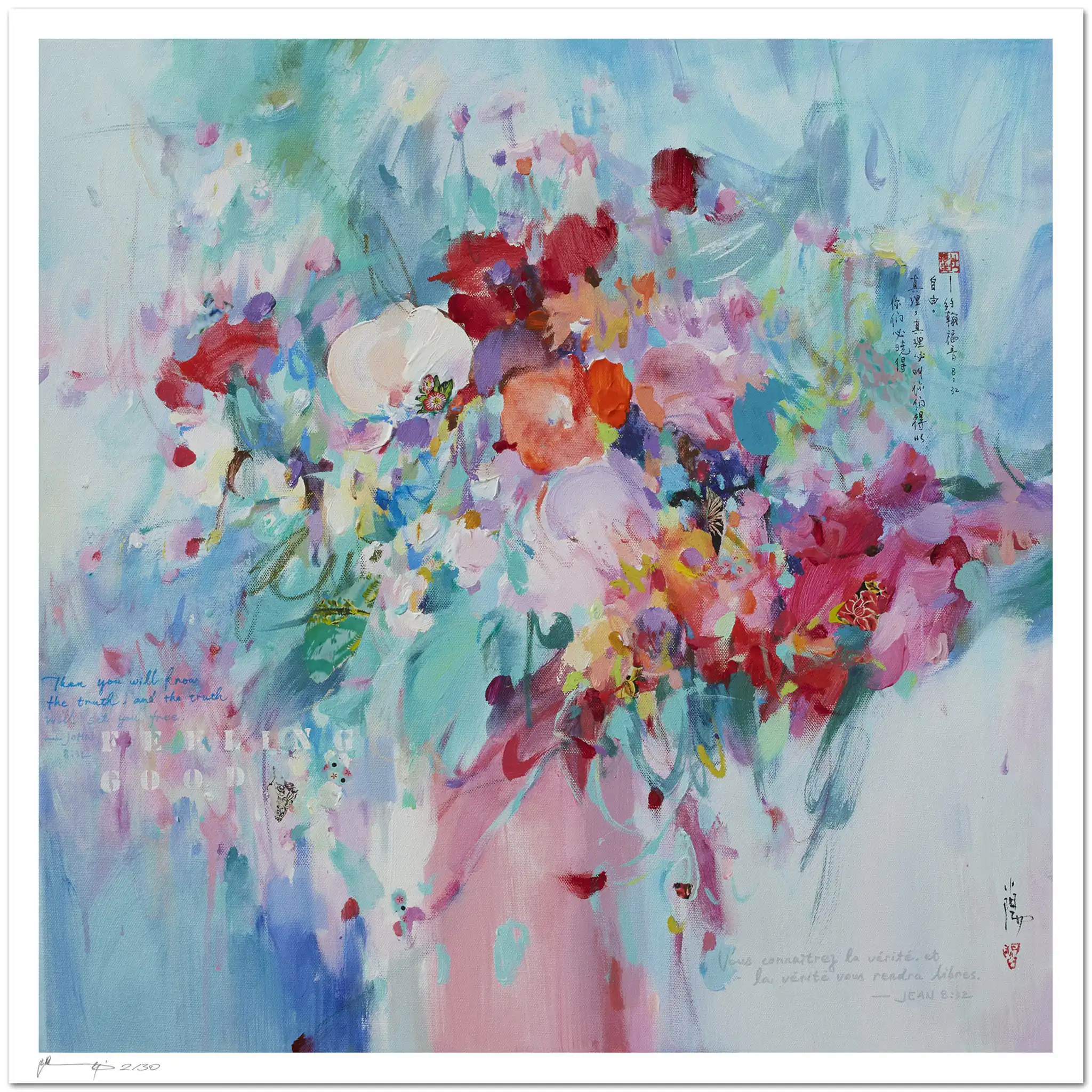 Measuring 60 x 60 cm, this limited-edition giclée print is meticulously produced on textured fine art paper, offering collectors an exclusive piece signed and numbered by the artist. With only 30 prints available, this artwork is a true celebration of artistic craftsmanship and vibrant expression. Galas combines bold multicolored strokes with nature-inspired elements, creating a dynamic composition that radiates warmth and energy. Her signature integration of Eastern and Western artistic traditions is evident in the use of collage and text, harmoniously blending cultural influences with contemporary aesthetics. The interplay of vibrant colors and intricate textures creates an immersive experience, inviting viewers to bask in its optimism. Perfect for modern living rooms, creative studios, or reception areas, "Feeling Good" infuses any space with a lively and refreshing atmosphere. Its timeless message of happiness and unity aligns with Galas' artistic philosophy of spreading love and peace through her work.
