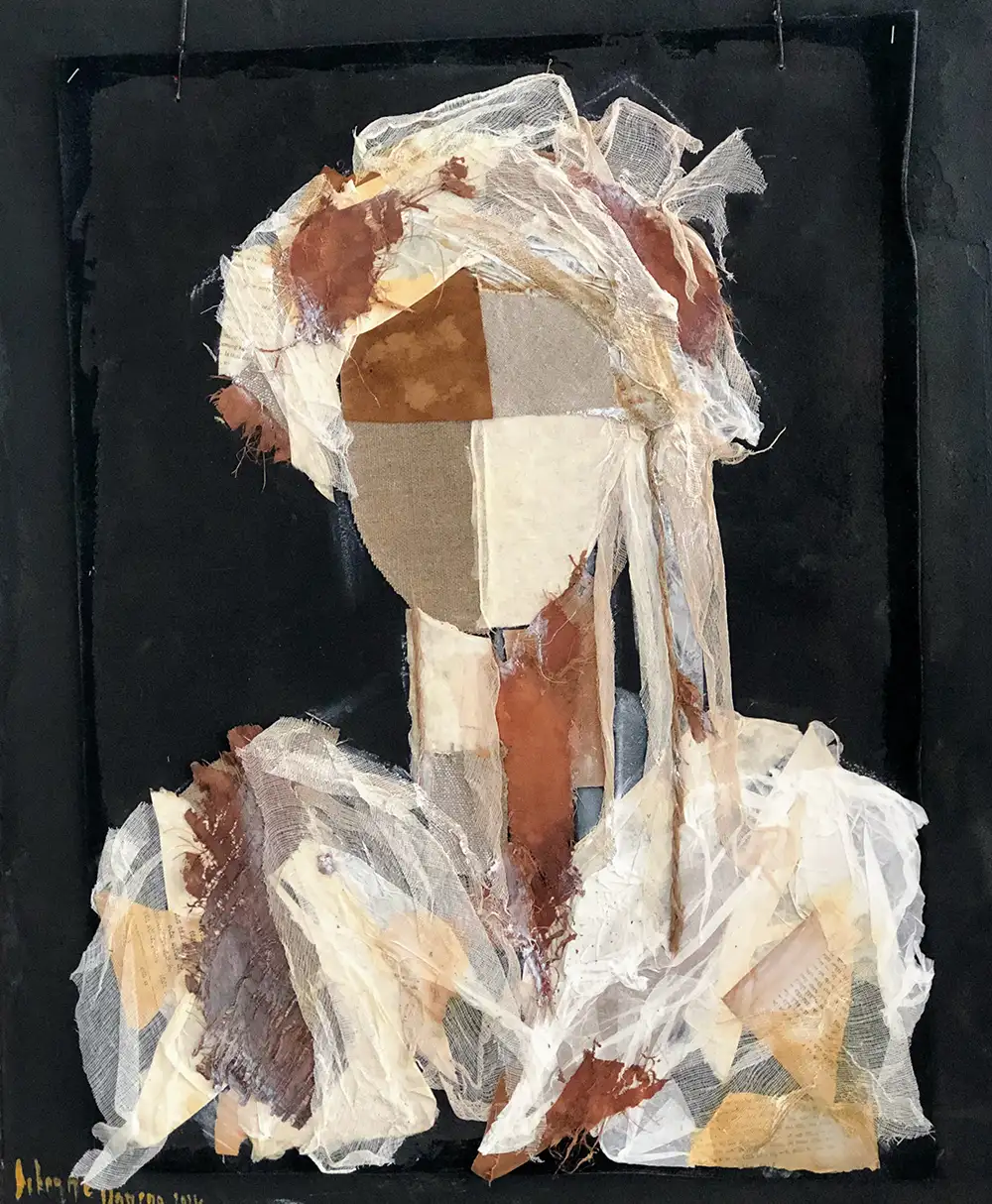 Femme du Monde sur Fond Cuir Noir is an evocative mixed media creation, weaving neutral and white textiles against a dark canvas.
