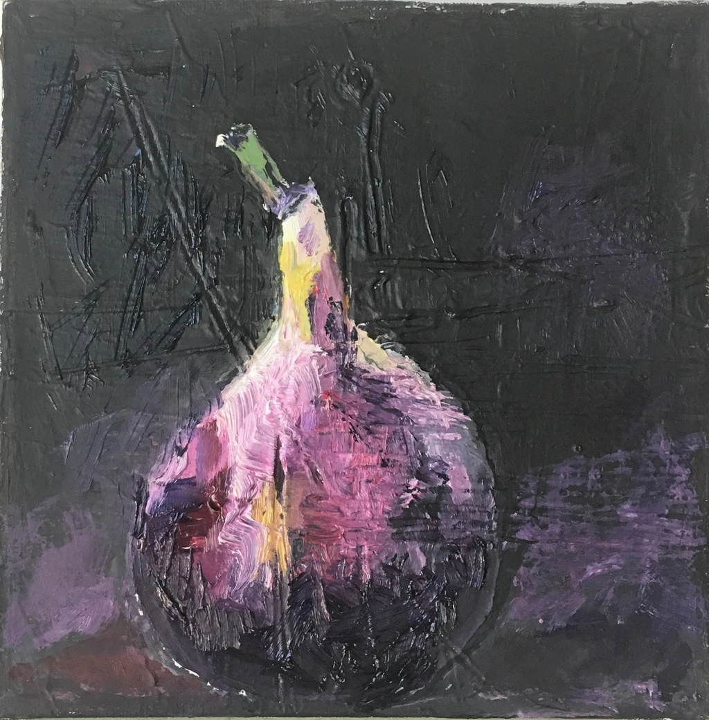 The dark backdrop, layered with black and gray tones, enhances the fig's vibrancy, making it the focal point of the composition. Highlights of yellow and green on the stem create a striking contrast, adding depth and organic realism to the piece. Argaman’s signature expressive approach transforms a simple subject into an evocative and mysterious portrayal, drawing the viewer into the painting’s rich textures and tones.