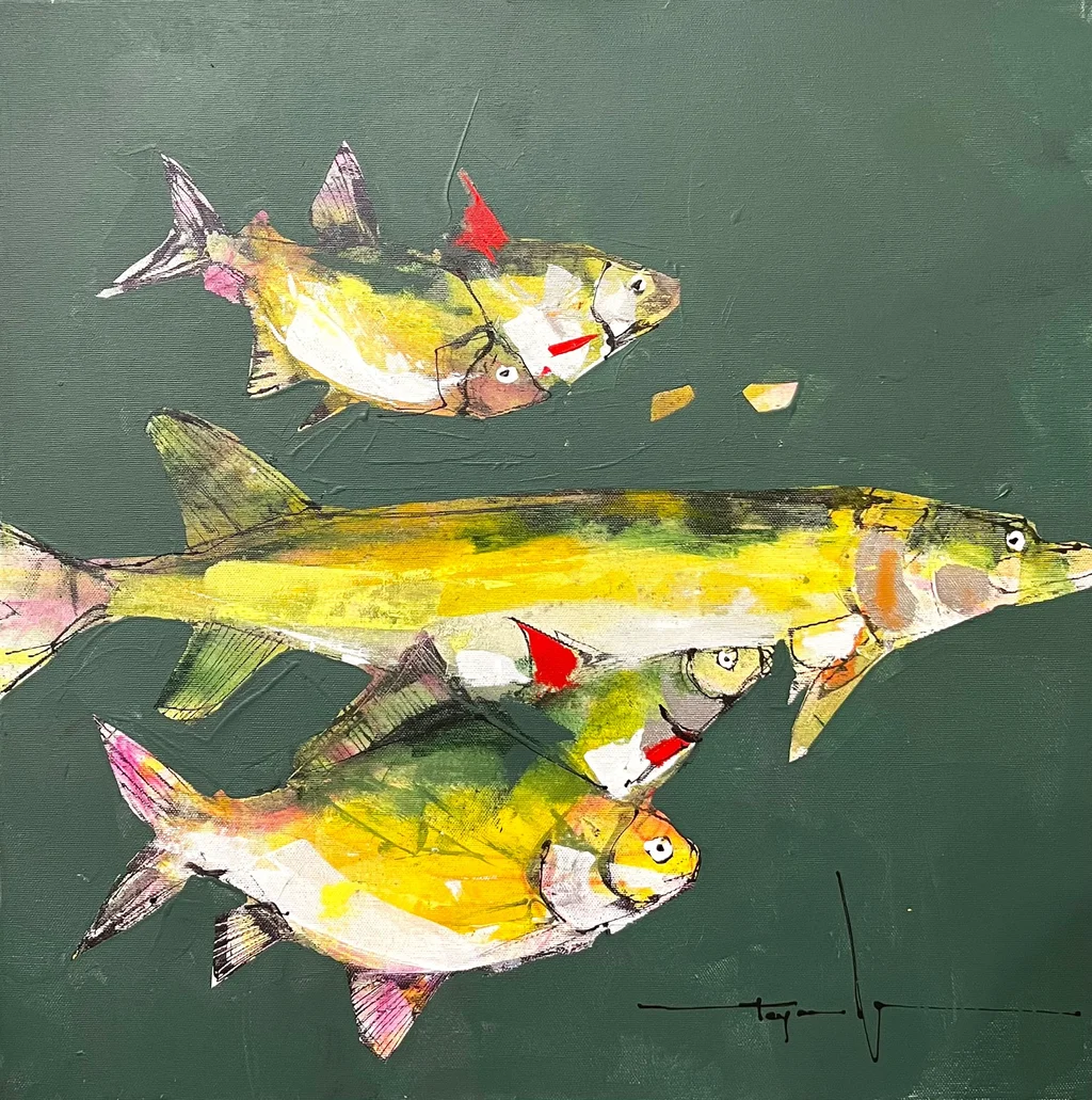 A vivid depiction of fish in motion, blending modern expressionism with serene aquatic elements, captured in acrylic art by Mugur Popa