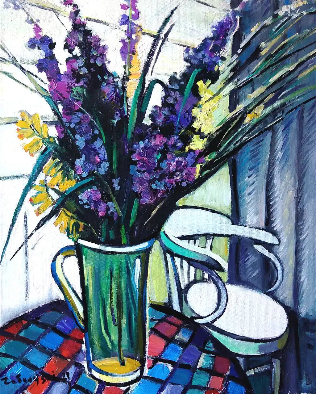 The bold purples, yellows, and greens of the flowers contrast beautifully with the blue and green hues of the background, creating a harmonious composition that draws the viewer in. The scene, set indoors, radiates an inviting warmth and elegance, as the vibrant blossoms seem to burst forth from the canvas. The placement of the vase on a multi-colored tablecloth adds a touch of whimsy and playfulness, while the presence of a white chair in the background suggests a cozy, intimate setting. Ideal for spaces such as living rooms, bedrooms, or galleries, "Floodplain Flowers" is a delightful addition that can brighten any environment. Its joyful, uplifting energy and elegant composition make it a perfect piece for home decor, celebrating the beauty and color of nature.