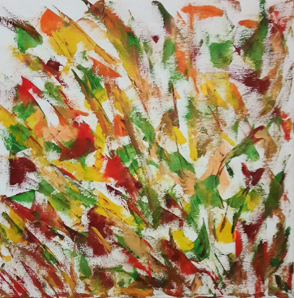 Painted in 2018, this 45x45 cm oil on canvas piece combines the artist’s signature style, using a palette knife technique to layer bold strokes of saturated color. Bright hues of red, yellow, green, and orange burst across the canvas in an energetic composition, evoking feelings of joy, happiness, and freedom. The floral theme, though abstracted, suggests the dynamic movement of nature, with vibrant colors blending to create an exciting and whimsical atmosphere.
