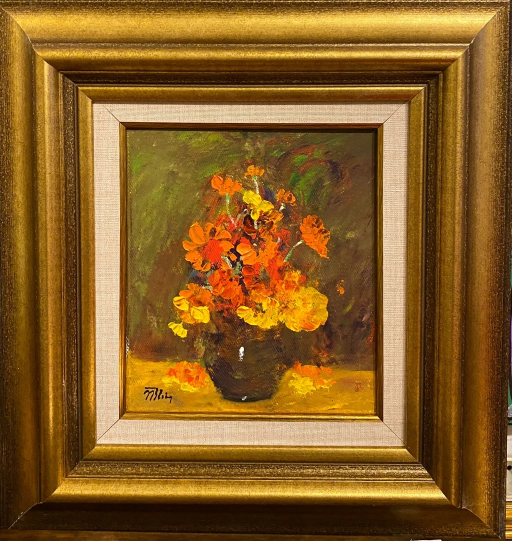 Painted in oil on canvas (40x35 cm), this composition is rich with expressive brushstrokes and a dynamic interplay of warm earthy tones. The contrast between the luminous petals and the muted green-brown background enhances the depth of the arrangement, making the blossoms appear lively and fresh.