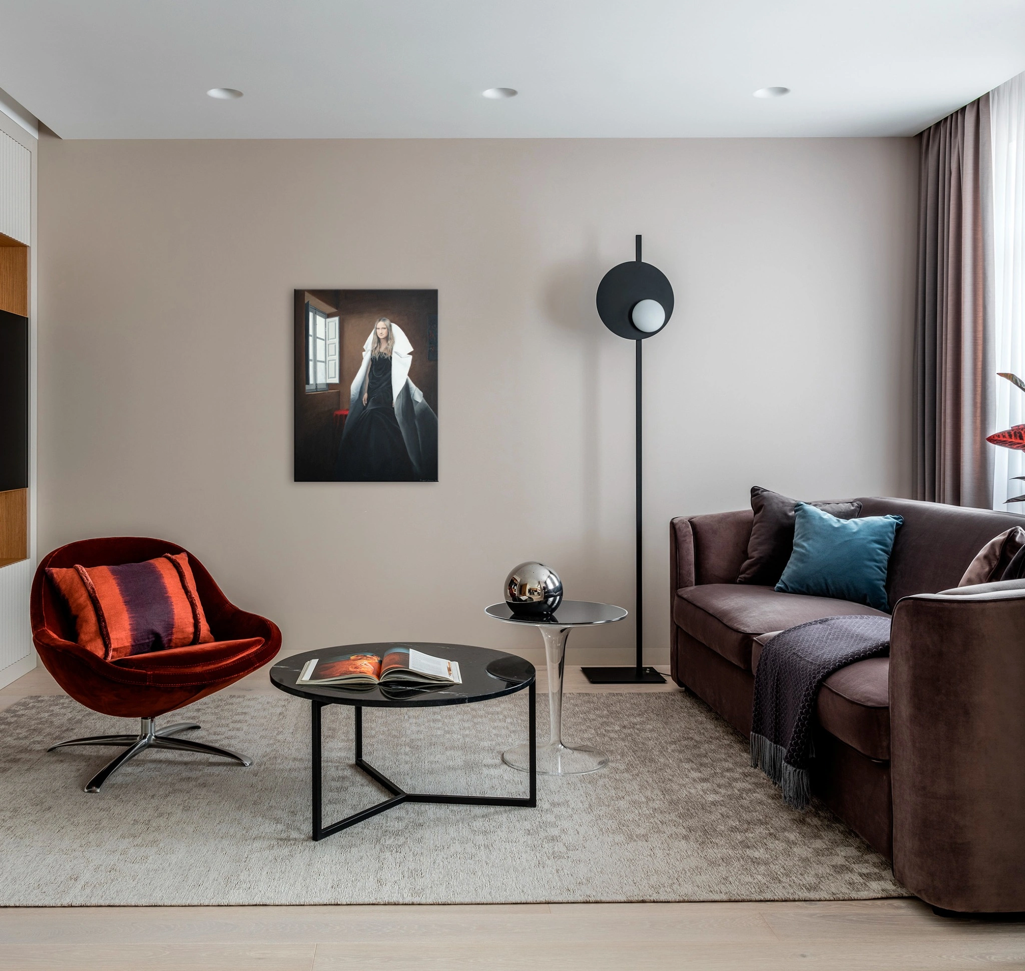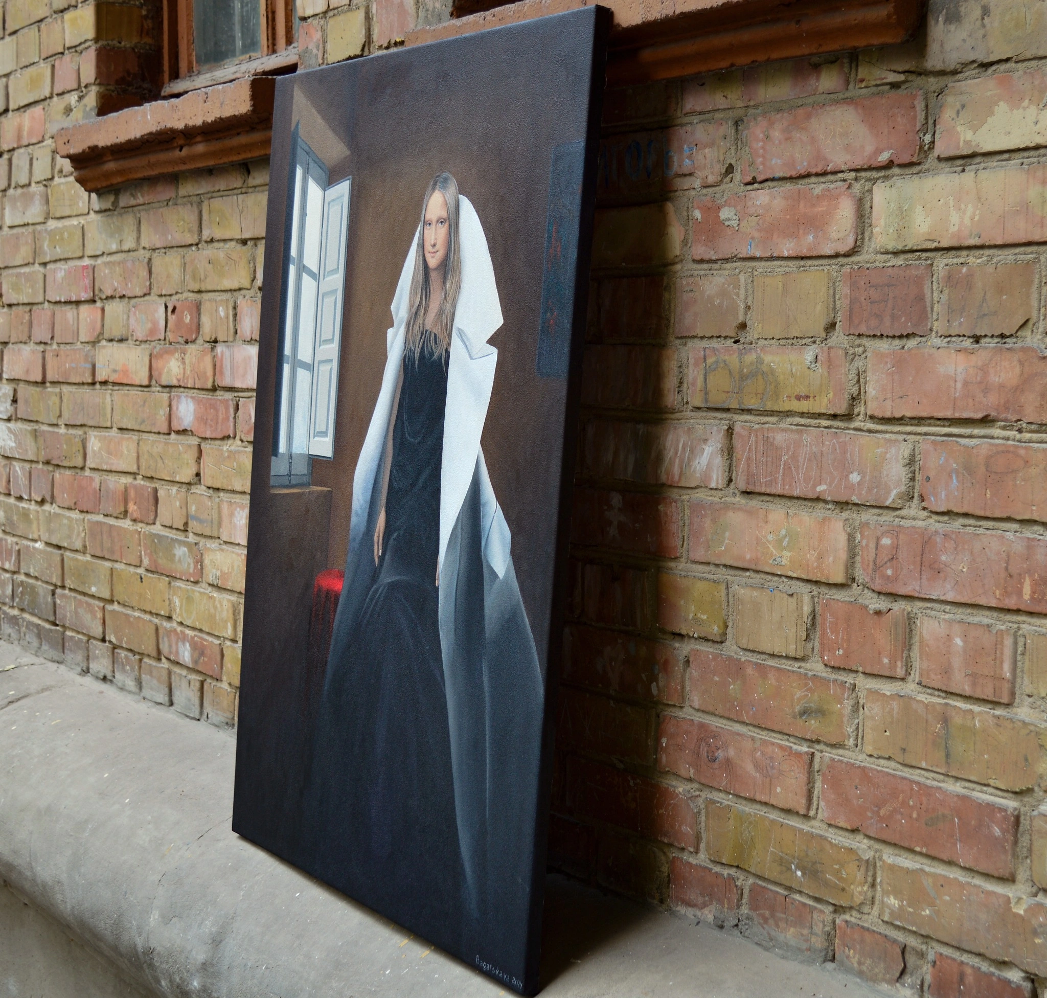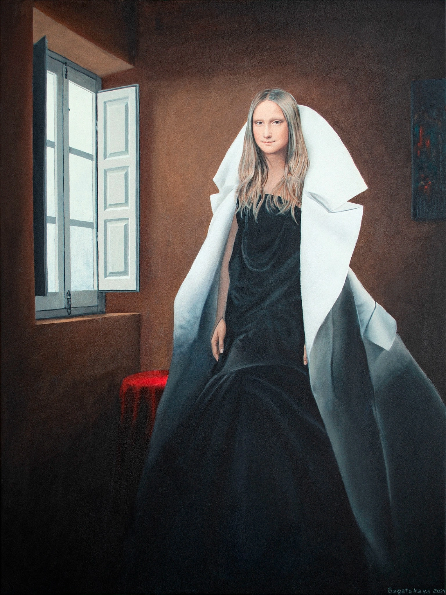“Flow of Time in the Window” by Nataliya Bagatskaya is a deeply symbolic realist portrait that explores stillness, presence, and inner awareness. A woman stands poised in a rustic room beside an open window, her black dress and sculptural white garment contrasting the quiet space around her. Evoking a feeling of timeless introspection, the piece reflects the tension between the ever-moving outside world and the enduring quiet of one’s inner self. With fine acrylic detailing and soft light, this work from the “Life in Avatar” series offers reflective depth for elegant interiors.