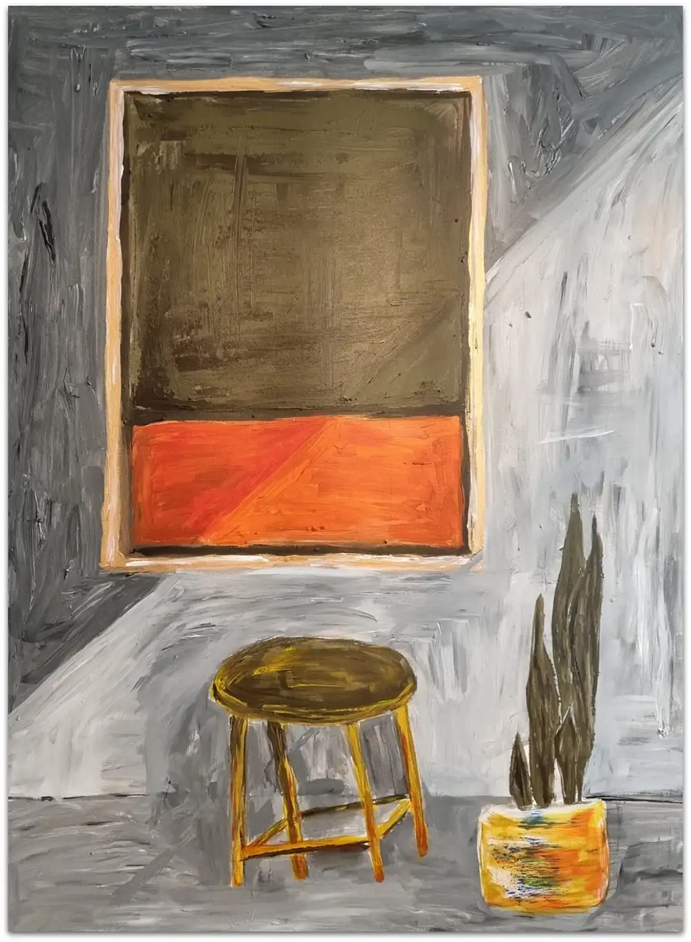 "Flower Pot with Chair" is a still life that speaks volumes in its simplicity and use of space. A sense of solitude pervades the scene, with the lone chair and flower pot suggesting a quiet moment in an otherwise empty room. The color palette is dominated by muted grays, contrasting sharply with the warmth of the golden chair and the vibrant red seen through the window. This artwork plays with the light, shadow, and texture to create a stark but inviting space. It would sit well in a contemplative environment such as a study or a reception area, where its evocative emptiness and the splash of warm colors can be pondered upon.