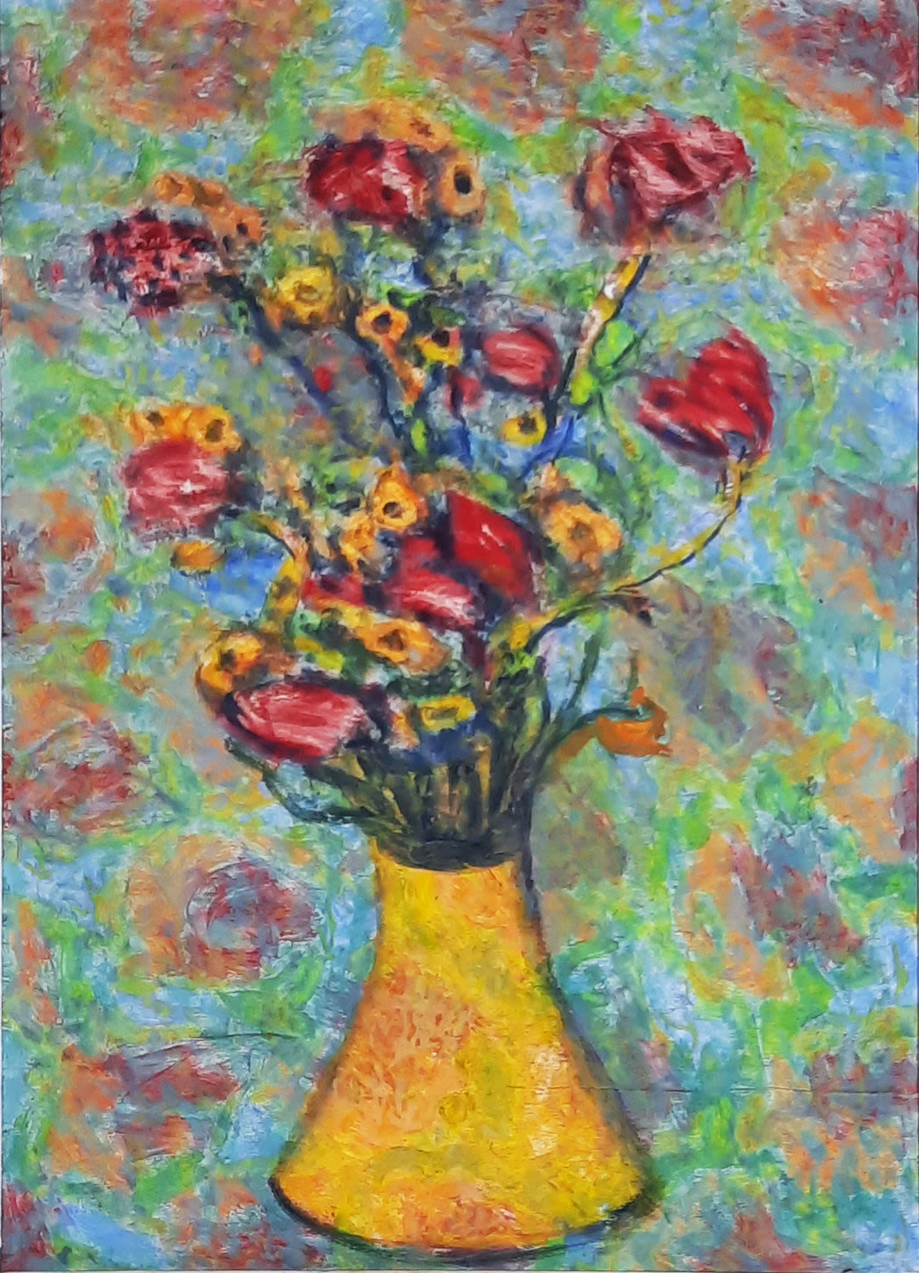 The expressive strokes and rich textures lend a unique depth to the painting, evoking a feeling of joy, tranquility, and appreciation for nature. The contrast between the bright, structured vase and the free-flowing flowers adds to the painting’s charm, making it both harmonious and energetic.