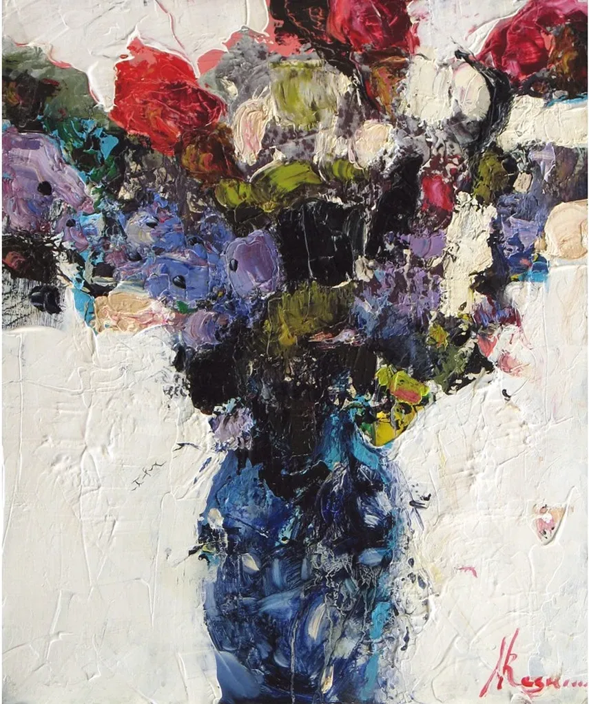 The vibrant bouquet bursts with deep blues, purples, reds, and greens, set against a creamy white background that enhances the dramatic contrast of colors. The textured application of paint creates depth and movement, making the flowers appear almost tangible. This still-life composition captures the essence of nature’s vitality while maintaining an abstract, contemporary appeal.