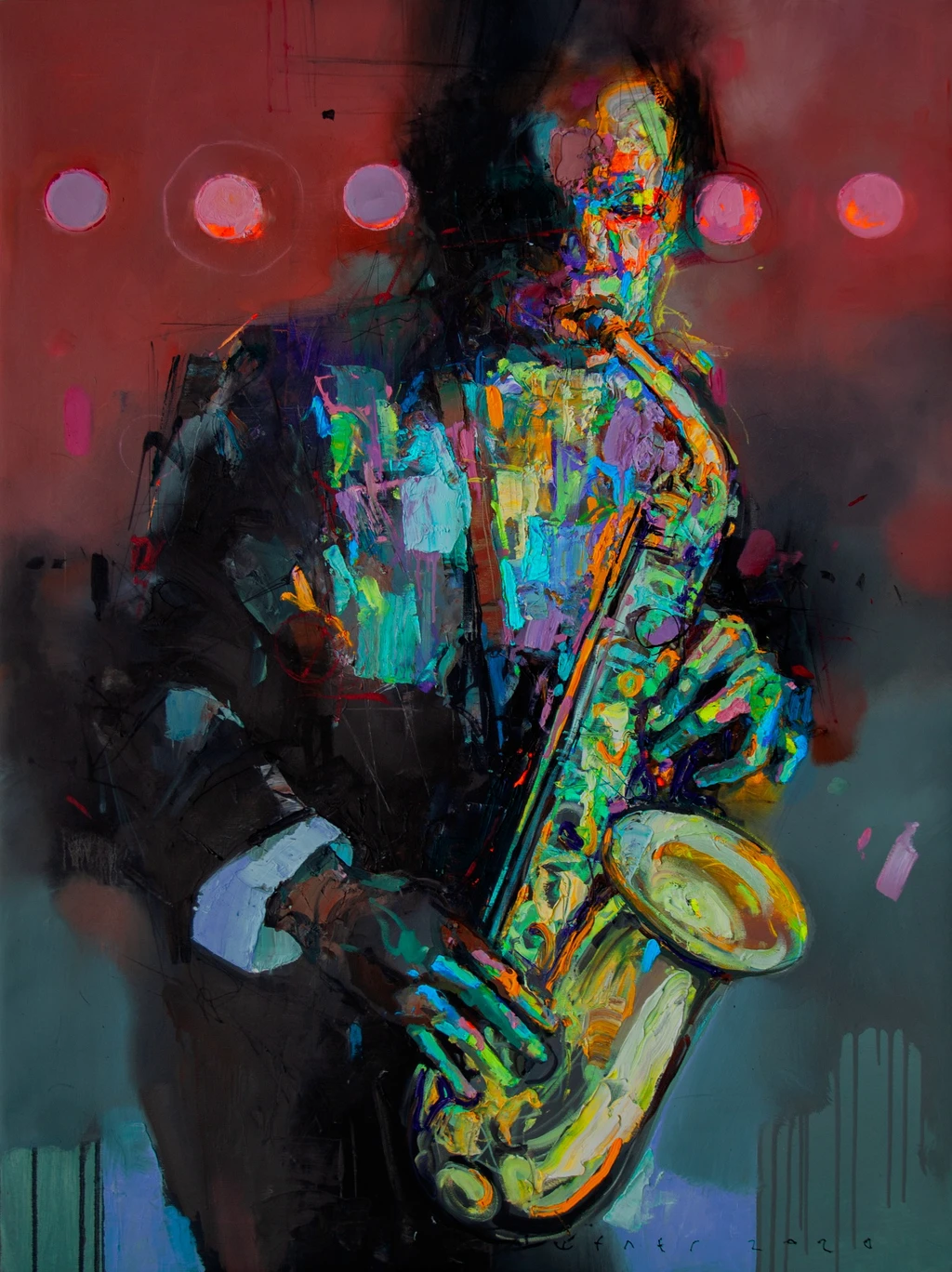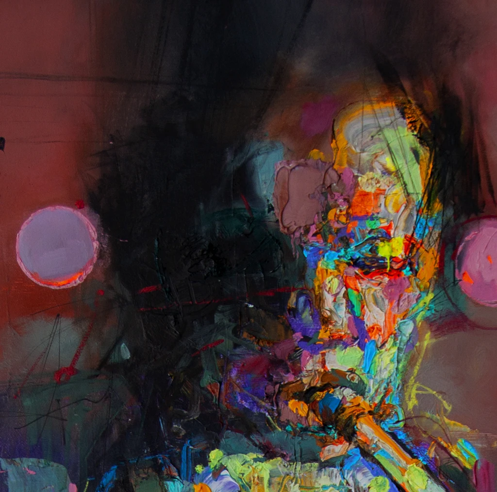 This 120x90 cm oil painting on canvas embodies the rhythm and intensity of jazz, depicting a saxophonist immersed in his performance. The musician’s fragmented form and vibrant neon blues, greens, and yellows pulsate against a deep red and black background, mimicking the movement and sound of flowing music.