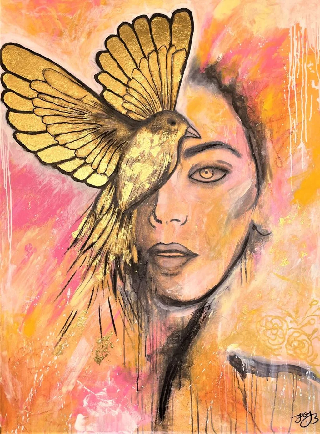 This mesmerizing artwork blends figurative expressionism with surreal symbolism, depicting a woman’s face partially merging with a majestic golden bird. The composition radiates empowerment, mystery, and awakening, inviting viewers to interpret its deeper meaning.