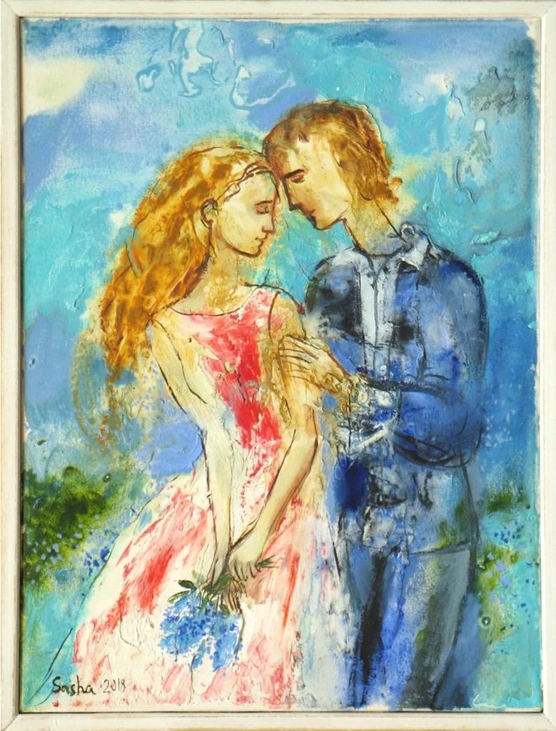 Bakhina’s expressive brushwork and layered textures create a mesmerizing movement, enhancing the emotional impact of the painting. The luminous interplay of warm and cool tones adds to the sense of nostalgia, making the piece feel both timeless and deeply personal. Whether displayed in a bedroom, romantic space, or an art gallery, "Forget Me Nots" is a poetic and heartfelt tribute to love, longing, and the beauty of human connection.